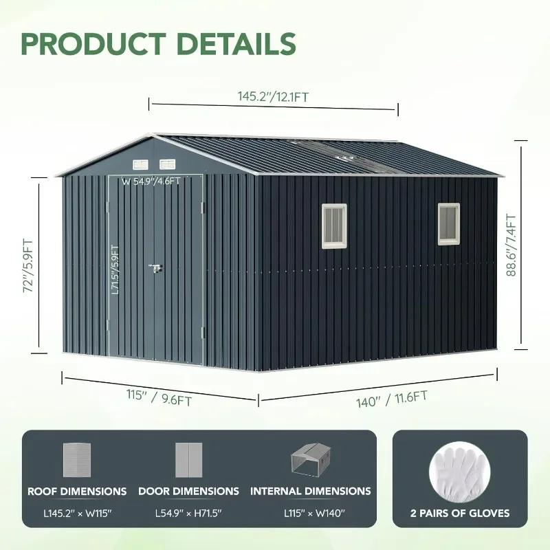 Organize your outdoor space with this 10×12 ft steel storage shed, designed for storing tools, equipment, bikes, and seasonal items. Built from galvanized steel, it offers strong weather-resistant protection against rust, wind, and moisture. The shed features two lockable doors for secure access and two built-in windows that allow natural light inside. Transparent roof panels enhance interior brightness without the need for electricity, making it easier to find stored items during the day. With generous interior height and floor space, it accommodates both large and small storage needs. Ideal for backyards, gardens, and work areas, this shed provides a reliable, long-lasting solution for keeping outdoor spaces clean and organized.