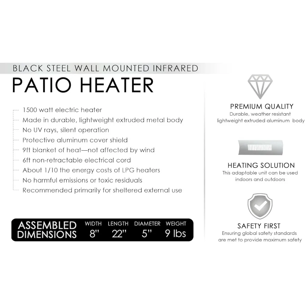 Lightweight and weatherproof, this heater is built for durability and convenience, with a 6-foot non-retractable power cord for easy installation. Its sleek design provides reliable warmth without taking up floor space, making it a smart and stylish heating solution for any environment.