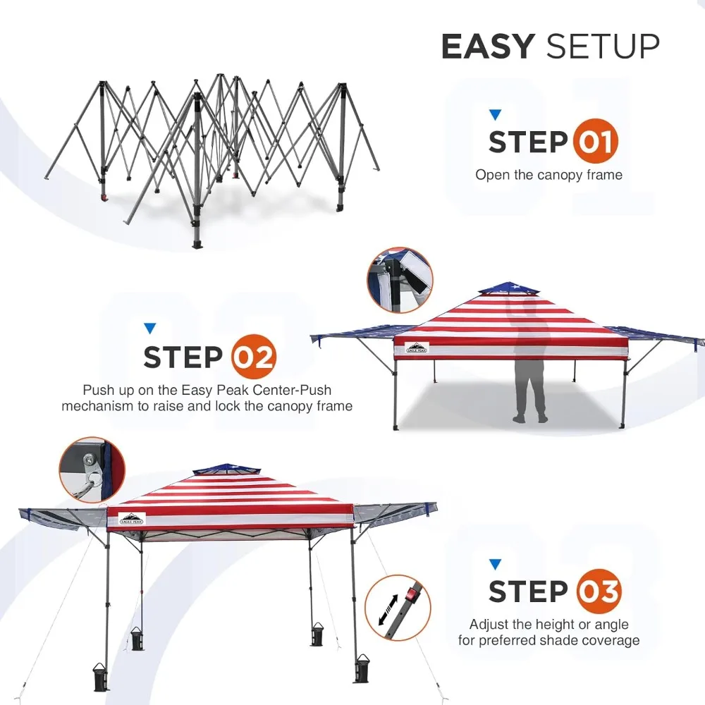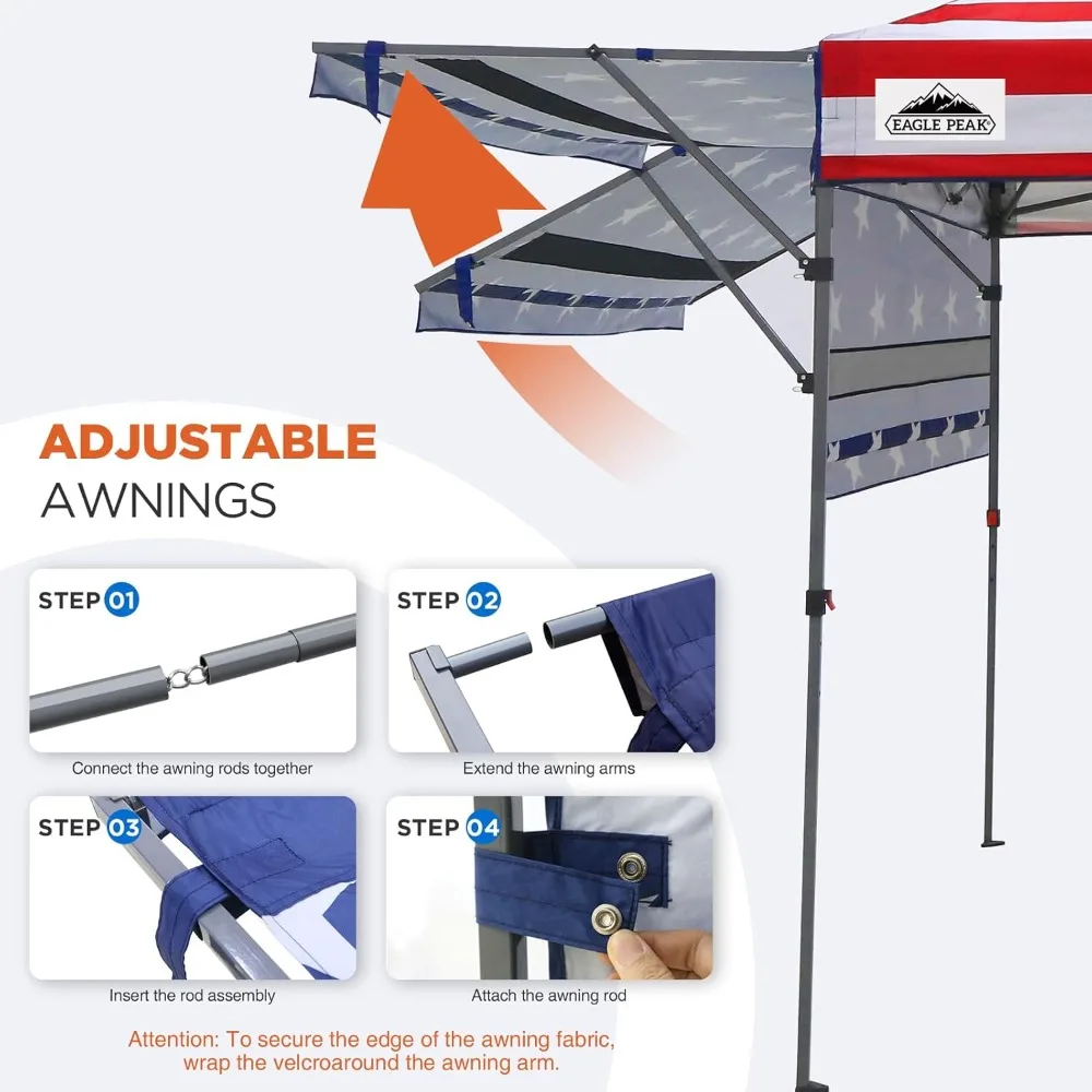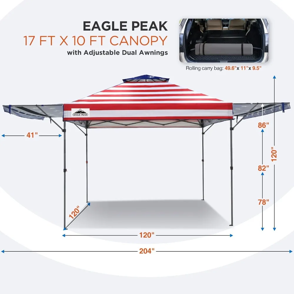 Celebrate in style with this 17×10 pop-up gazebo canopy tent featuring adjustable dual half awnings and a bold American flag design. Whether you’re hosting a backyard barbecue, setting up for a festival, or creating shade at a sporting event, this instant canopy offers quick setup and spacious coverage for guests and gear.