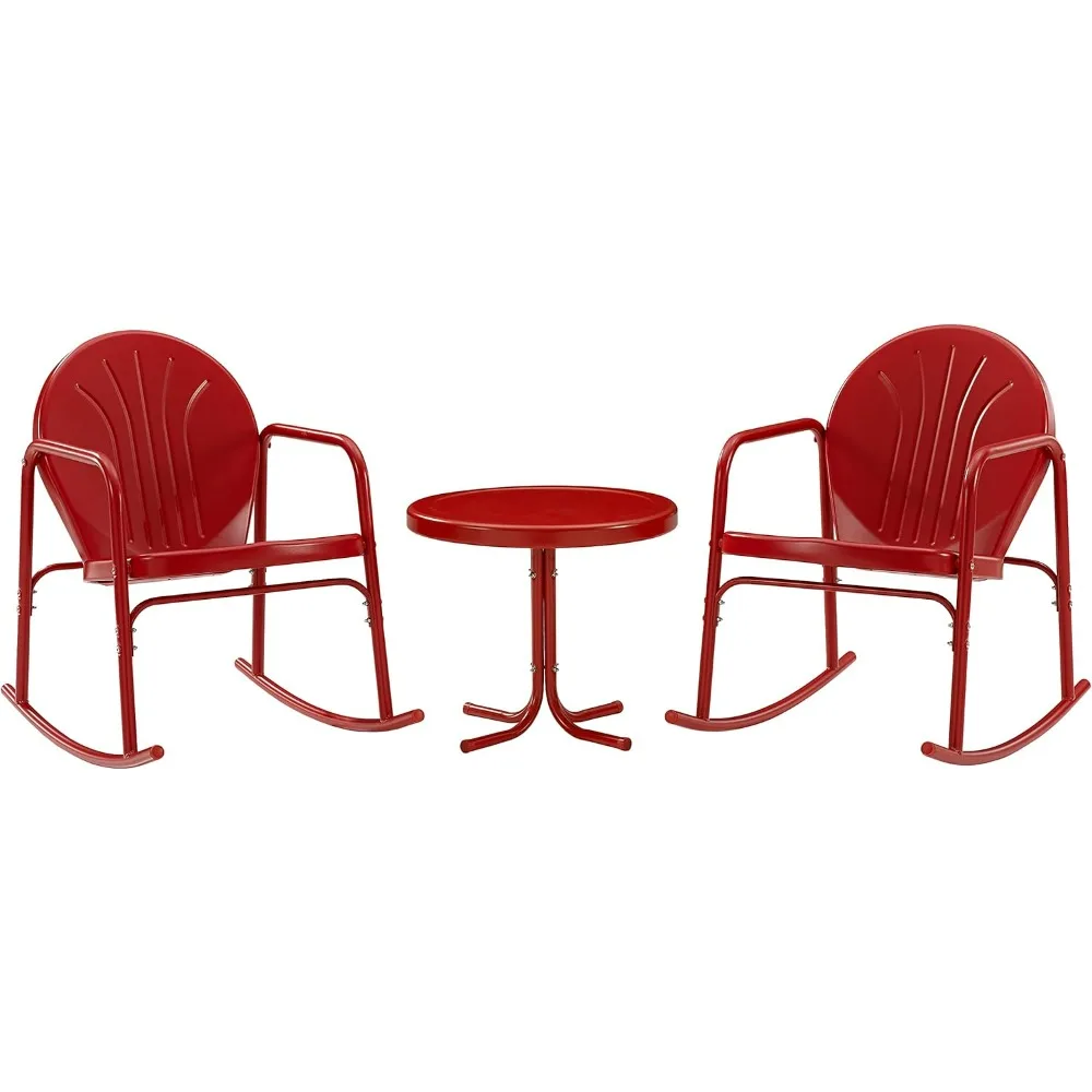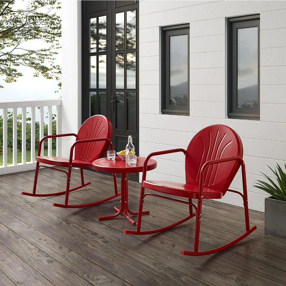 Add a splash of vintage charm to your outdoor space with the 2025 Retro-Style Crosley Griffith 3-piece rocking chair set. Featuring two bright red metal rocking chairs and a matching side table, this bistro-style patio set blends nostalgic design with modern durability. The powder-coated steel construction resists rust and weather, making it perfect for porches, patios, or garden corners.