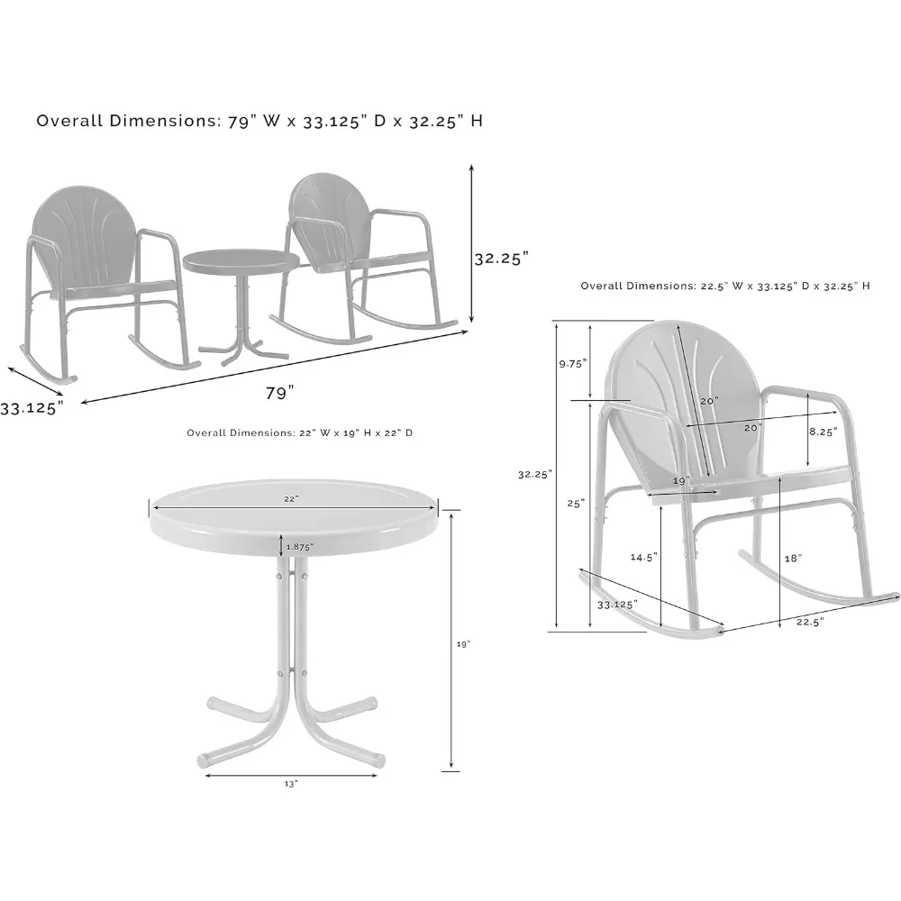 The smooth rocking motion and contoured seats offer comfort and relaxation, while the compact side table provides a convenient spot for drinks or décor. With its bold color and timeless silhouette, this set is a stylish and functional addition to any outdoor retreat.