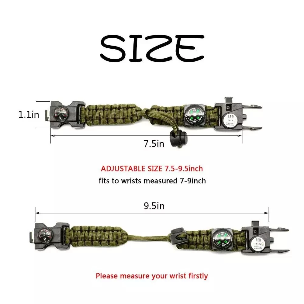 This 21-in-1 Adjustable Paracord Survival Bracelet is a compact yet powerful emergency tool designed for outdoor enthusiasts, hikers, campers, and anyone who values preparedness. Woven from strong paracord rope, it includes built-in survival essentials such as an SOS flashlight, compass, thermometer, whistle, fire starter, cutting tool, and more—giving you quick access to critical gear right from your wrist. The adjustable strap ensures a comfortable fit for men and women, while the lightweight design makes it easy to wear daily or pack in a bug-out bag. Whether you’re navigating the wilderness, starting a fire, signaling for help, or monitoring temperature, this bracelet puts multiple life-saving tools in one convenient accessory. Ideal for survival kits, emergency planning, or outdoor adventures, it offers peace of mind knowing you’re always prepared for the unexpected.