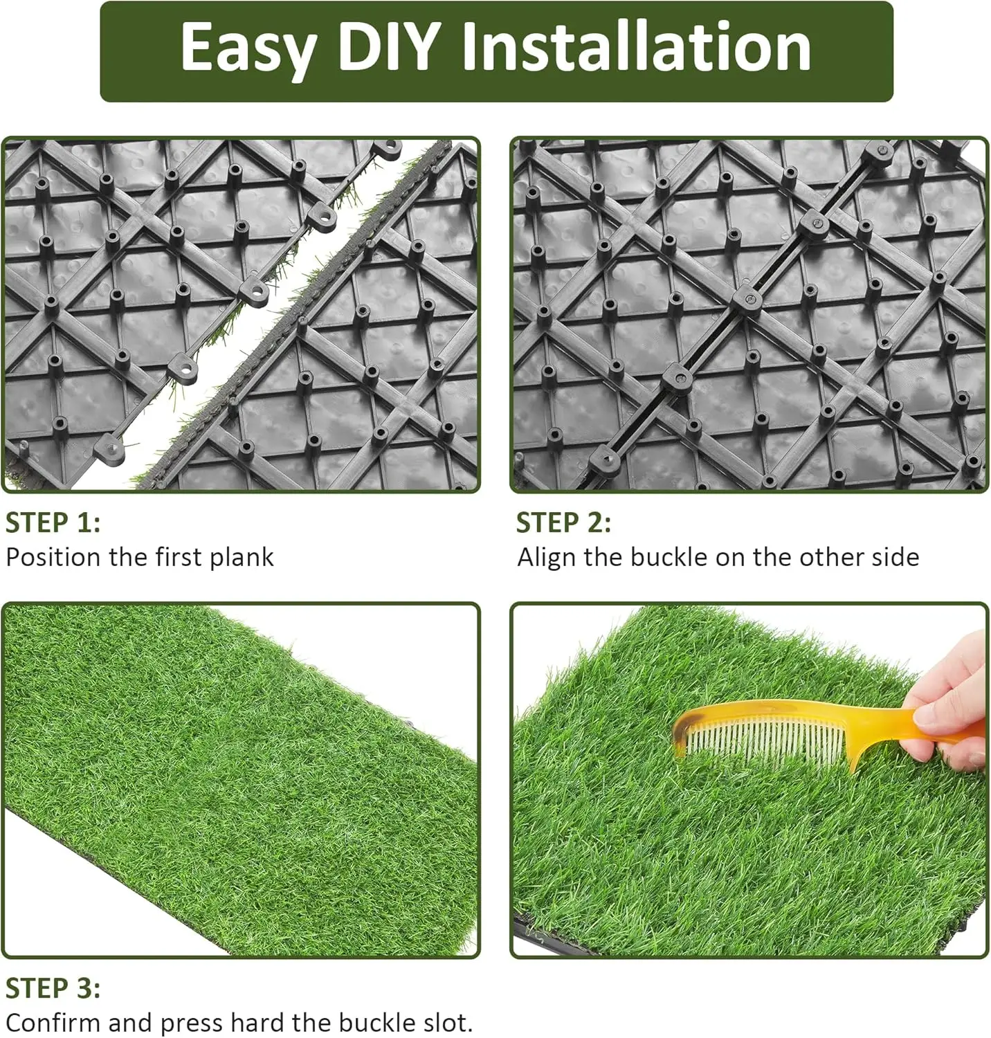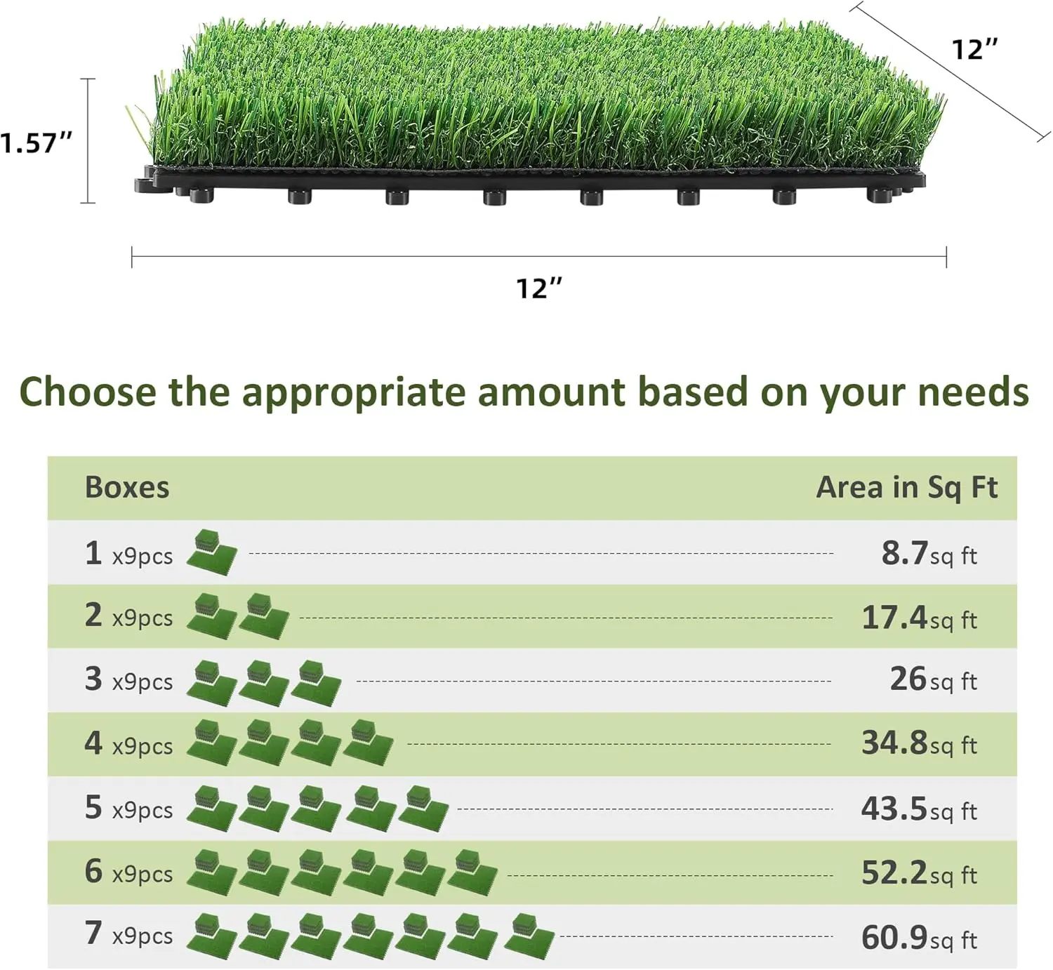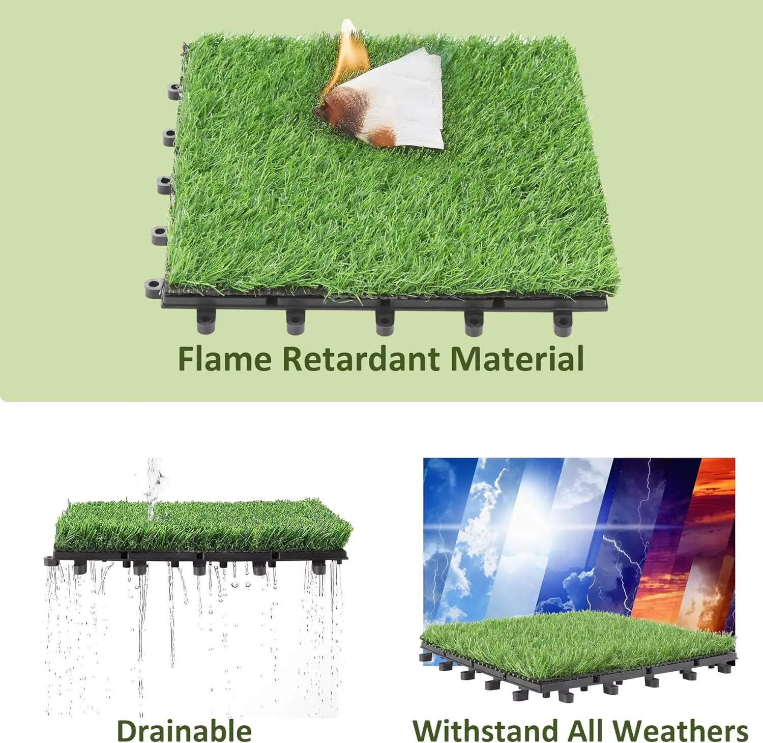 Bring the beauty of lush green turf to any space with this 27-piece set of 12″x12″ interlocking artificial grass tiles. Perfect for patios, balconies, backyards, or indoor areas, these tiles snap together effortlessly for a quick, tool-free DIY installation. The high-quality synthetic grass provides a natural look and soft texture while being durable, low-maintenance, and weather-resistant. Designed to withstand foot traffic and outdoor conditions, each tile drains easily and resists fading, keeping your space vibrant and fresh year-round. Ideal for creating a green retreat, play area, or stylish floor accent, these modular tiles transform any surface into a comfortable, visually appealing, and hassle-free environment.