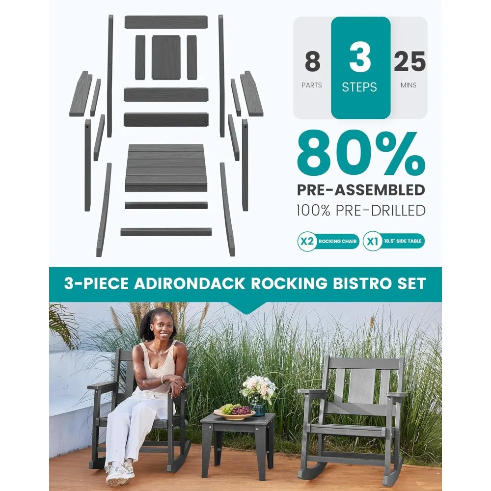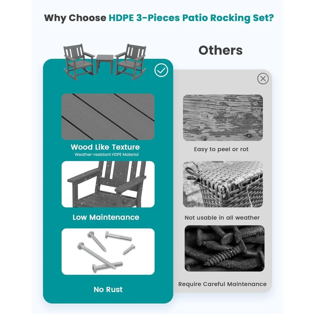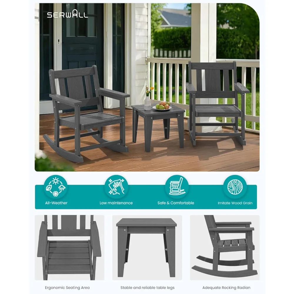 The accompanying table offers a convenient surface for beverages, books, or decorative accents, completing the ensemble with both functionality and charm. Its timeless design and neutral tones integrate seamlessly with a variety of outdoor aesthetics, from classic to contemporary. Whether hosting guests or enjoying quiet solitude, this 3-piece rocking chair set offers a perfect blend of comfort, elegance, and enduring quality for your outdoor retreat.