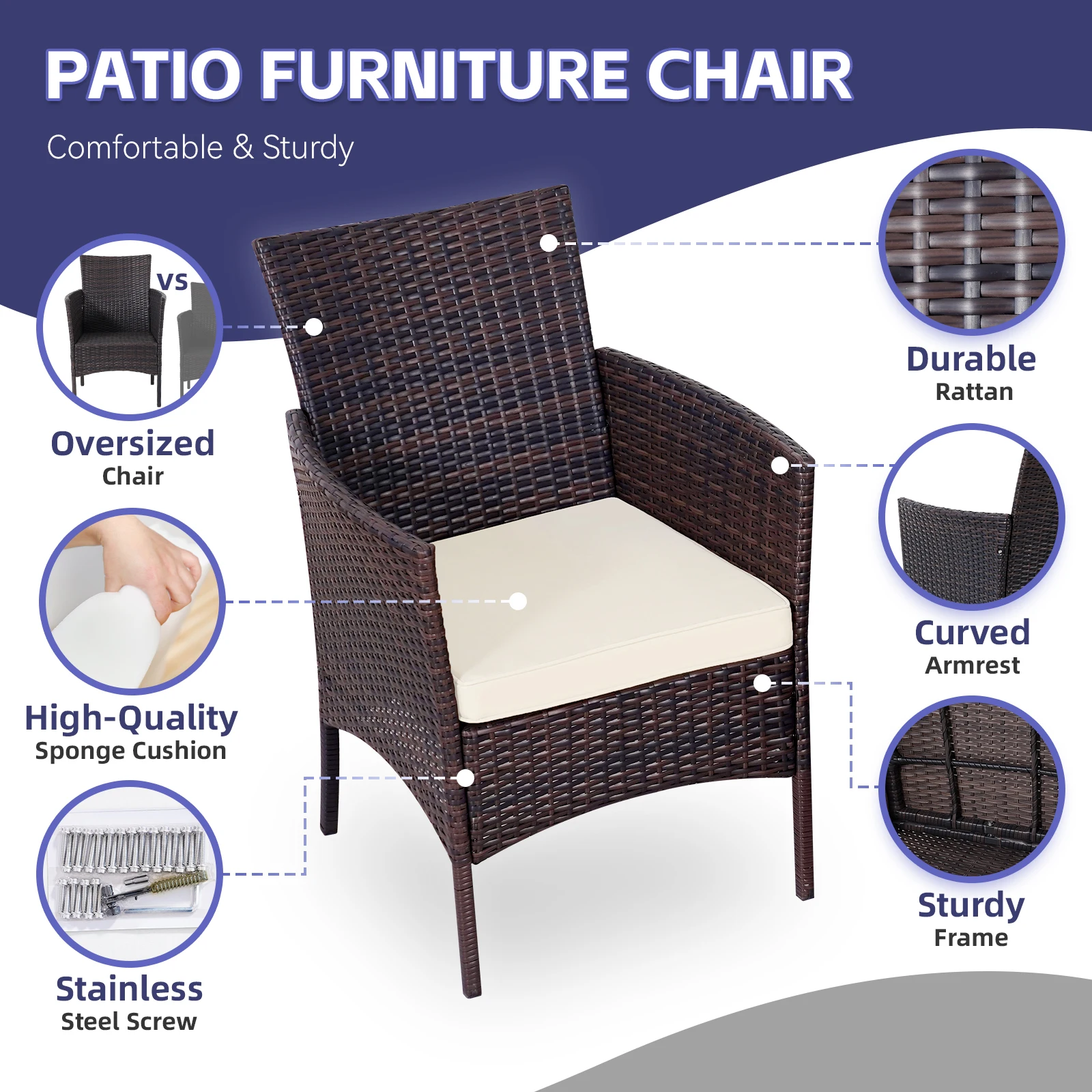 Enhance your outdoor space with this 3-piece rattan bistro patio set, thoughtfully designed for comfort, durability, and style. Featuring two cushioned chairs and a tempered glass table, it creates a cozy spot for morning coffee, casual meals, or intimate conversations. Ideal for patios, gardens, or balconies, the set’s durable construction ensures long-lasting enjoyment while providing a serene and inviting atmosphere. This bistro set transforms ordinary outdoor spaces into a restorative retreat, blending functionality with elegant charm for moments of relaxation and connection.