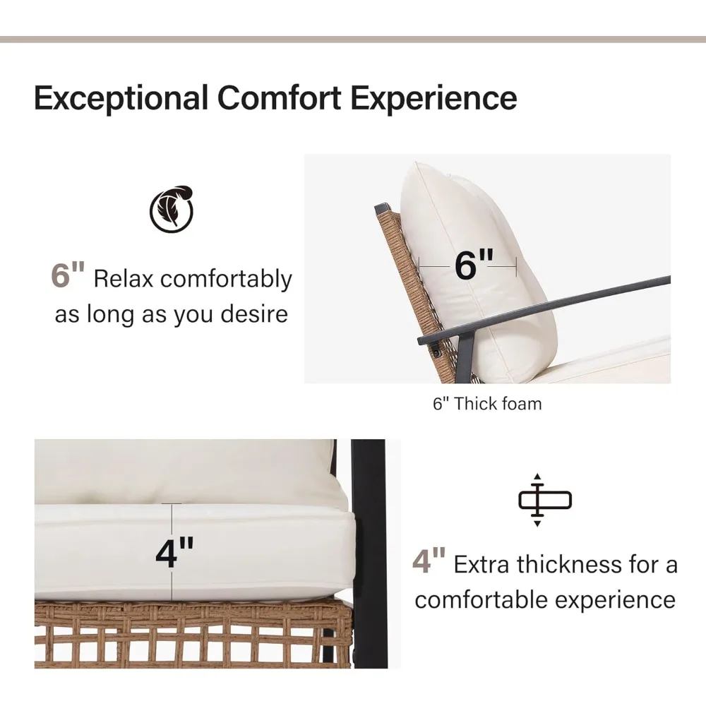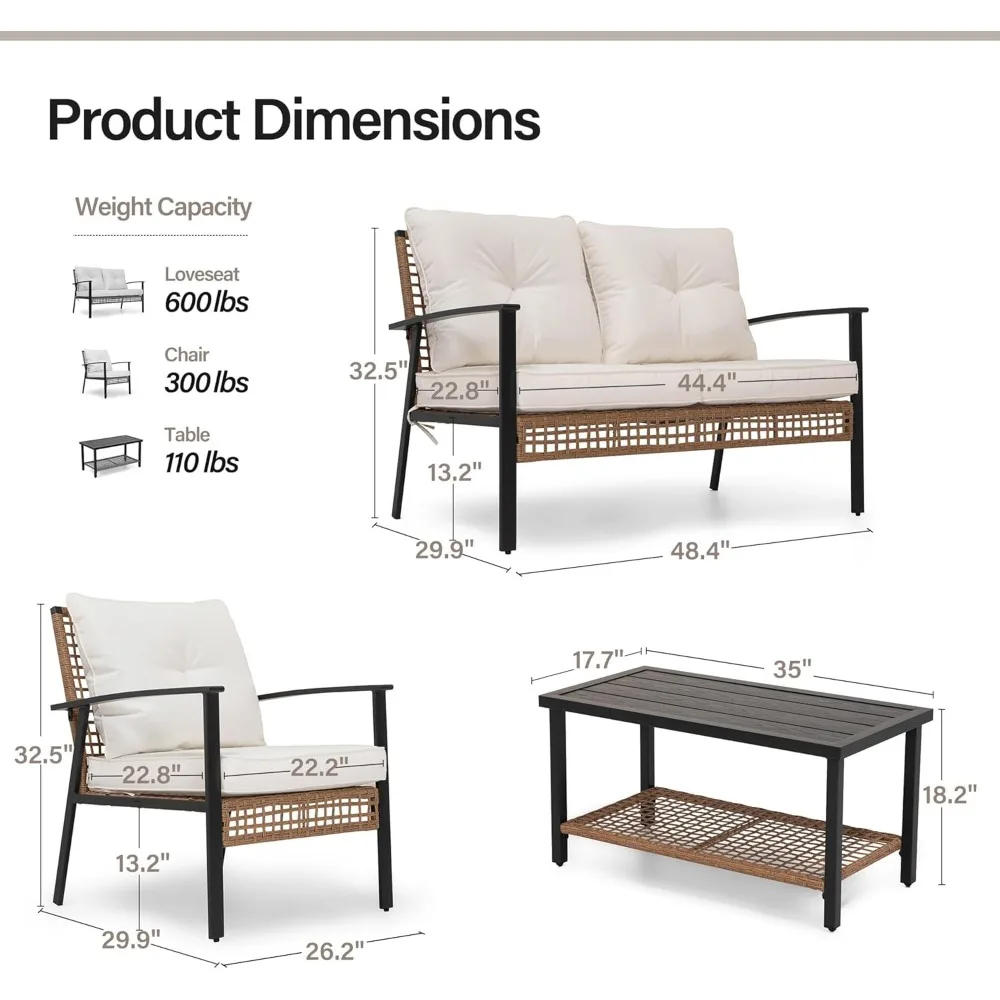Transform your outdoor space into a sanctuary of comfort and connection with this 4-piece patio lounge set. Designed with oversized seating and soft cushions, it offers the perfect balance of relaxation and durability for gardens, patios, or poolside retreats. The included metal coffee table features built-in storage, keeping essentials close at hand while maintaining a clean, organized look. Each piece is crafted to withstand the elements, ensuring long-lasting beauty and strength, while the plush cushions invite you to unwind in serenity. More than furniture, this set becomes a restorative haven—an invitation to pause, breathe, and enjoy the gentle rhythm of outdoor living. Whether hosting family gatherings, sharing quiet afternoons, or entertaining friends under the open sky, this lounge set embodies harmony between practicality and soulful design. Stylish yet functional, it is not just décor—it is a vessel of renewal, a symbol of balance, and a daily reminder that serenity can be cultivated in the comfort of your own backyard.