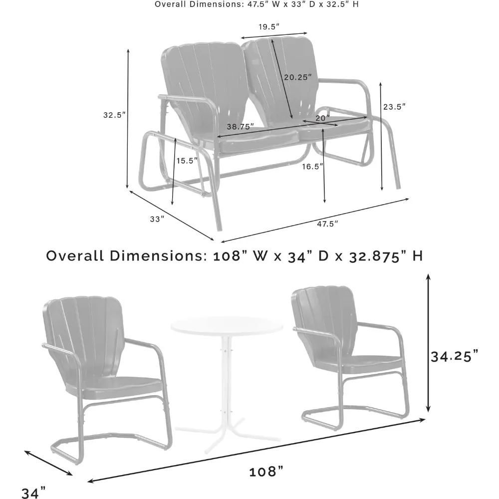 Bring vintage charm to your outdoor space with this 4-piece retro metal patio furniture set, featuring a smooth gliding loveseat, two matching chairs, and a coordinating side table. Designed in a classic mid-century style with a glossy navy finish, this set adds both personality and comfort to porches, decks, and garden areas. The durable powder-coated metal construction resists rust, weather, and fading, ensuring long-lasting outdoor use. The loveseat glider offers a relaxing back-and-forth motion, while the chairs provide sturdy, supportive seating. Perfect for morning coffee, evening chats, or weekend lounging, this set combines nostalgic design with modern durability for an inviting outdoor retreat.