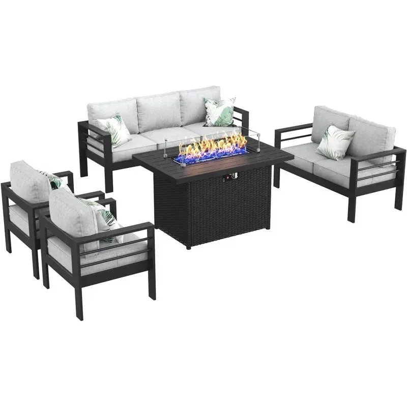 Create a cozy and stylish outdoor retreat with this 5-piece aluminum patio sectional set featuring a built-in fire pit table. Designed for modern comfort and durability, the set includes a spacious chat-style sofa and a sleek fire pit centerpiece that adds warmth and ambiance to any gathering. The rust-resistant aluminum frame ensures long-lasting use, while the contemporary design complements patios, decks, and garden spaces. Perfect for entertaining or relaxing under the stars, this conversation set combines functionality, elegance, and year-round comfort in one inviting package.