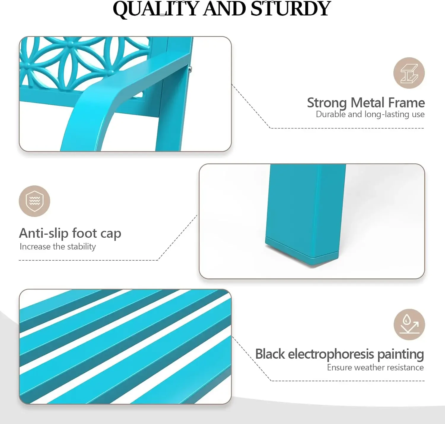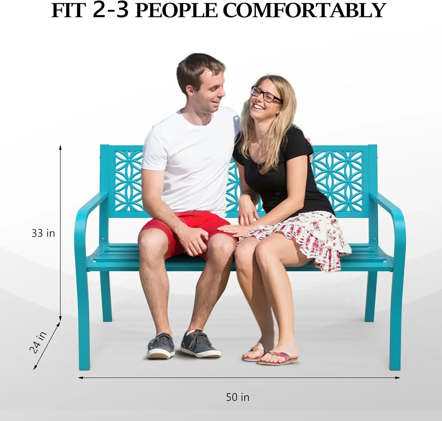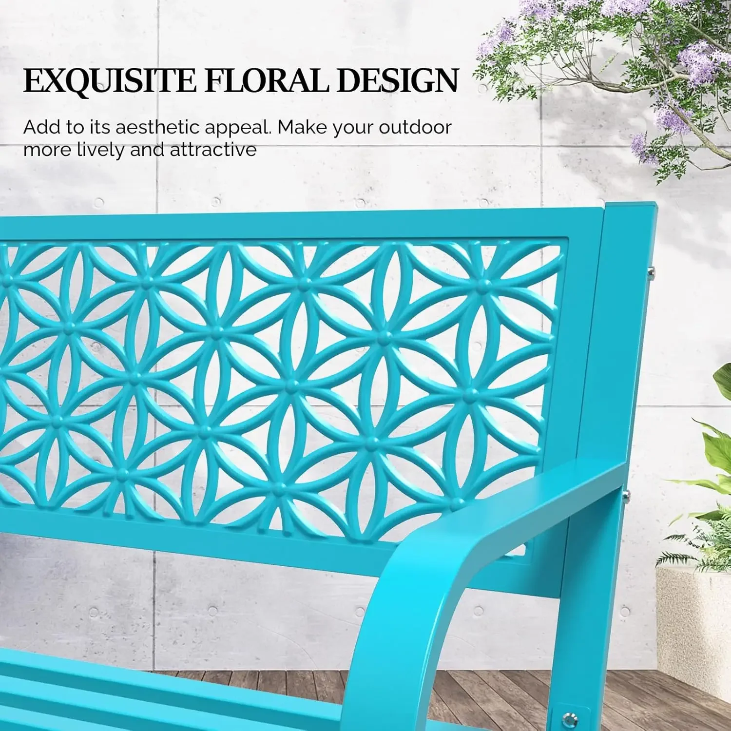 Add charm and comfort to your outdoor space with this 50″ metal garden bench featuring a decorative floral backrest. Perfect for front porches, patios, yards, or parks, its classic design blends elegance with functionality. The sturdy metal frame ensures long-lasting durability, while the contoured seat provides a comfortable spot for two people to relax and enjoy the outdoors.