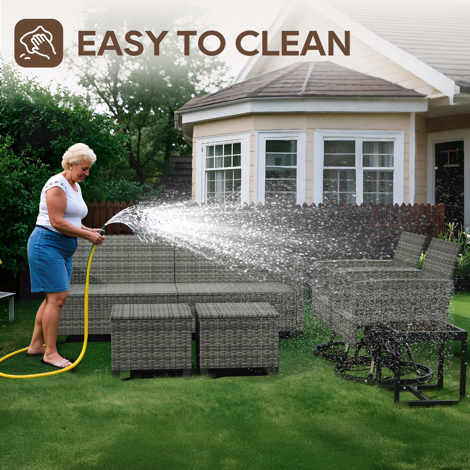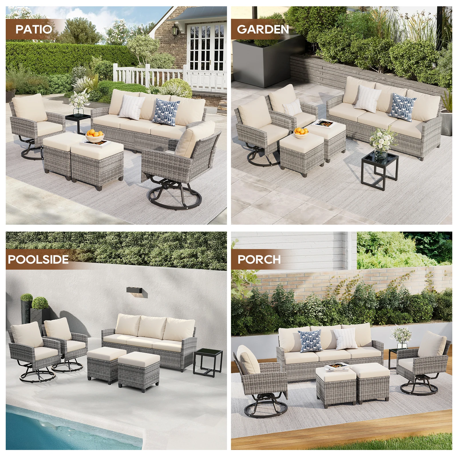 Turn your patio into a sanctuary of comfort with this 6-piece wicker furniture set, designed for both style and durability. Featuring two swivel chairs, a spacious 3-seat sofa, a cushioned ottoman, and a tempered glass side table, this set creates the perfect balance of elegance and practicality. Crafted from all-weather wicker, it withstands the elements while maintaining timeless charm, making it ideal for gardens, porches, balconies, or poolside retreats. The swivel chairs add versatility and movement, while the plush cushions invite you to relax and enjoy the gentle rhythm of outdoor living. The tempered glass table provides a sturdy surface for drinks, snacks, or decorative accents, completing the conversation area with sophistication. More than furniture, this set becomes a restorative haven—an invitation to pause, breathe, and connect with loved ones under the open sky. Stylish yet functional, it embodies harmony between durability and soulful design. Easy to maintain and versatile in layout, this wicker patio set is not simply décor—it is a vessel of renewal, a symbol of balance, and a daily reminder that serenity can be cultivated in the comfort of your own backyard.