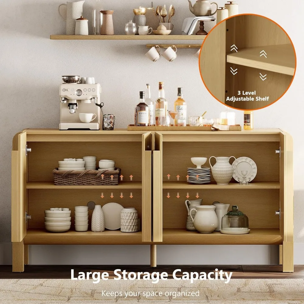 Enhance your living space with this 63-inch modern buffet sideboard cabinet, thoughtfully designed to blend style, storage, and functionality. Featuring ample storage compartments and a curved design, it serves as a versatile piece for coffee bars, wine storage, or general home organization. Its sleek modern aesthetic complements contemporary interiors while providing a harmonious and practical centerpiece for kitchens, dining rooms, or living areas. Durable and elegant, this cabinet transforms ordinary storage into a serene and inviting hub, perfect for entertaining, everyday use, or quiet moments of restorative enjoyment.