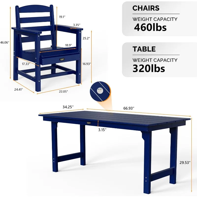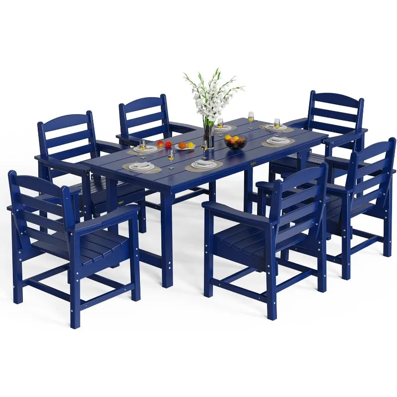 Dine outdoors in comfort and style with this 7-piece HDPE patio dining set, featuring a durable rectangular table with an umbrella hole and six matching chairs. Built from high-quality, weather-resistant HDPE material, it’s designed to withstand the elements while maintaining its elegant appearance.