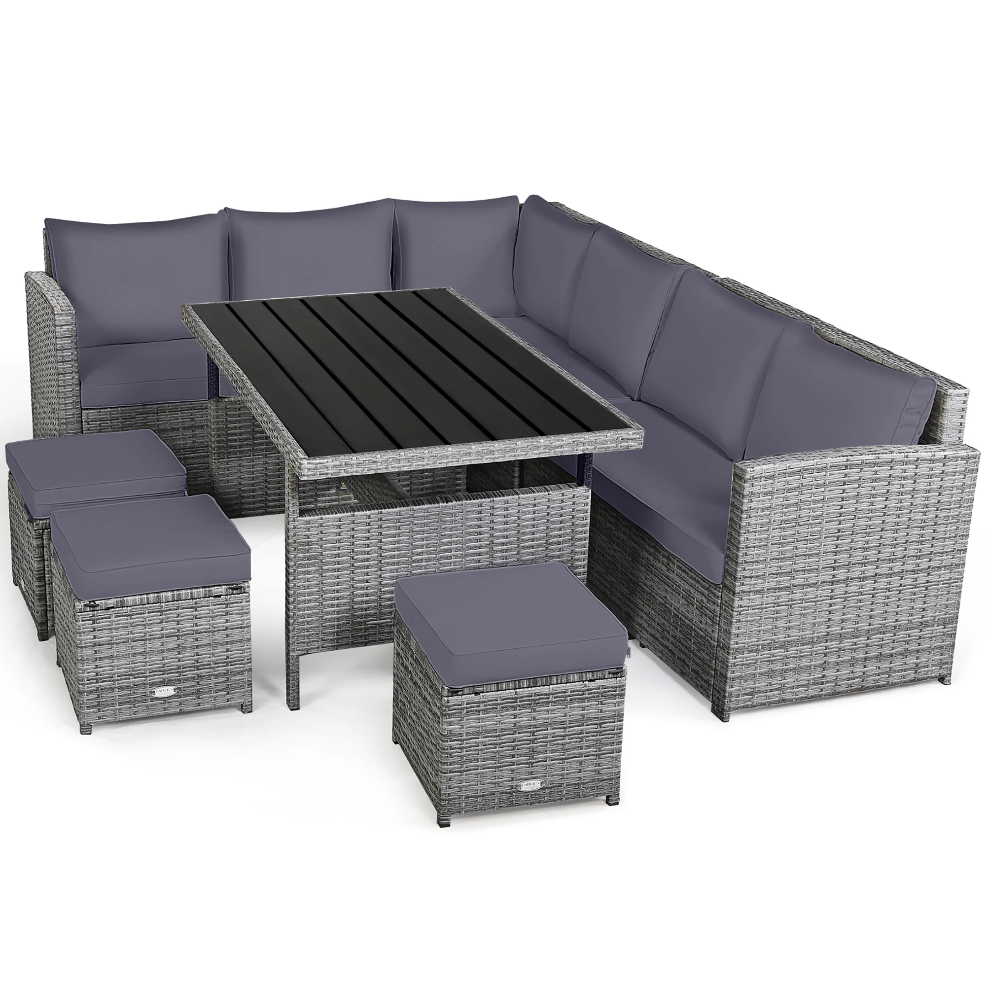 Create a serene and stylish outdoor space with this 7-piece rattan patio dining set, thoughtfully designed for comfort, versatility, and aesthetic appeal. Featuring a sectional sofa, ottoman, and dining setup in elegant grey, it provides the perfect setting for meals, relaxation, or entertaining guests. Ideal for gardens, patios, or balconies, its durable materials and sophisticated design enhance any outdoor environment. This patio set transforms everyday outdoor living into a restorative and inviting retreat, blending functional comfort with peaceful ambiance.