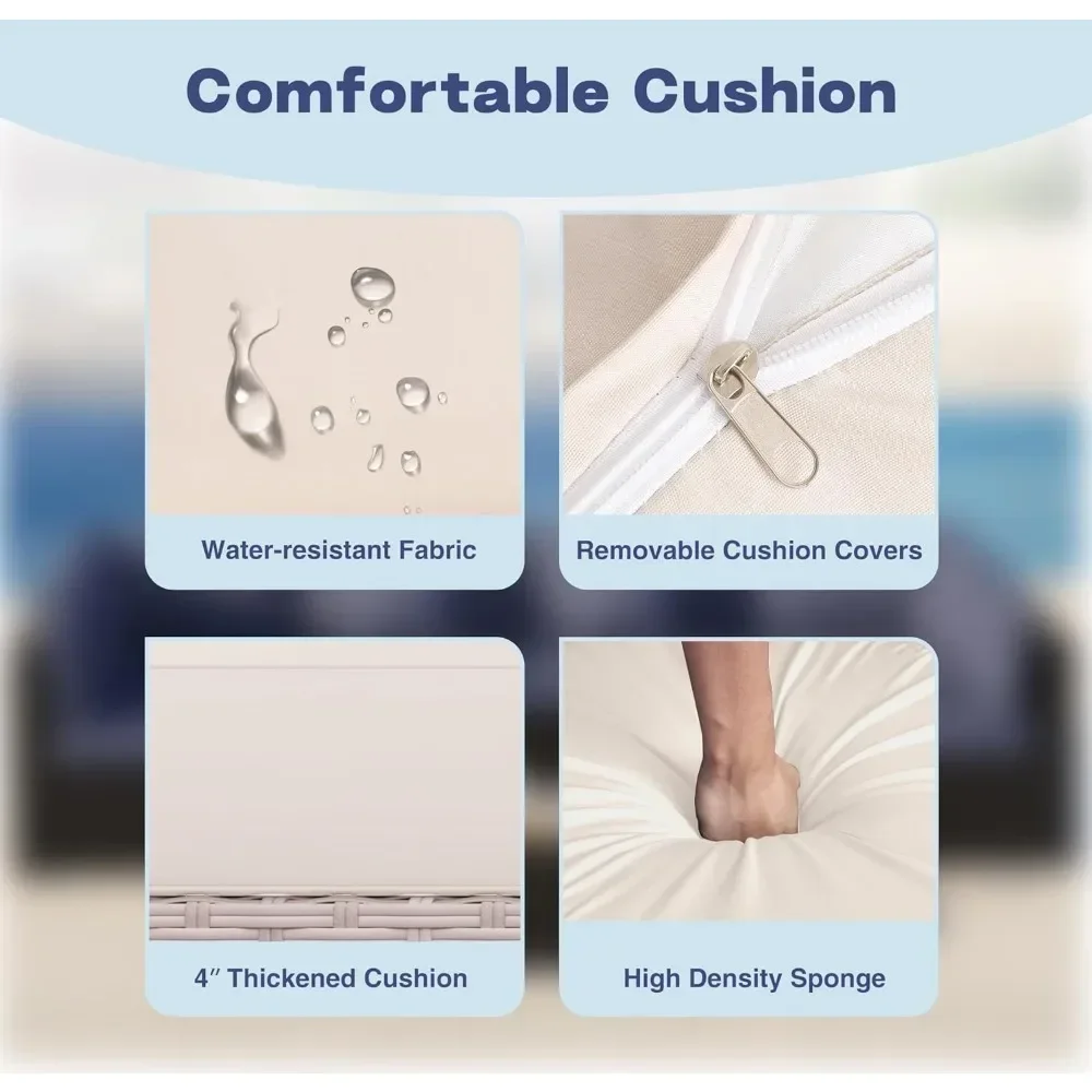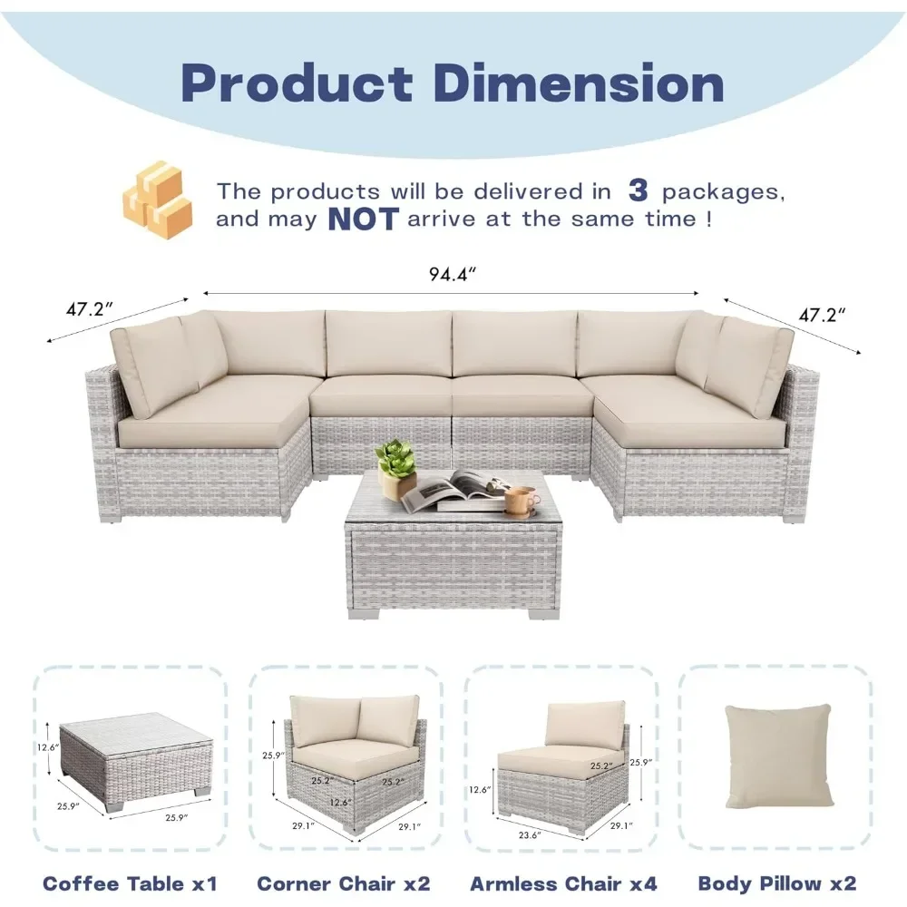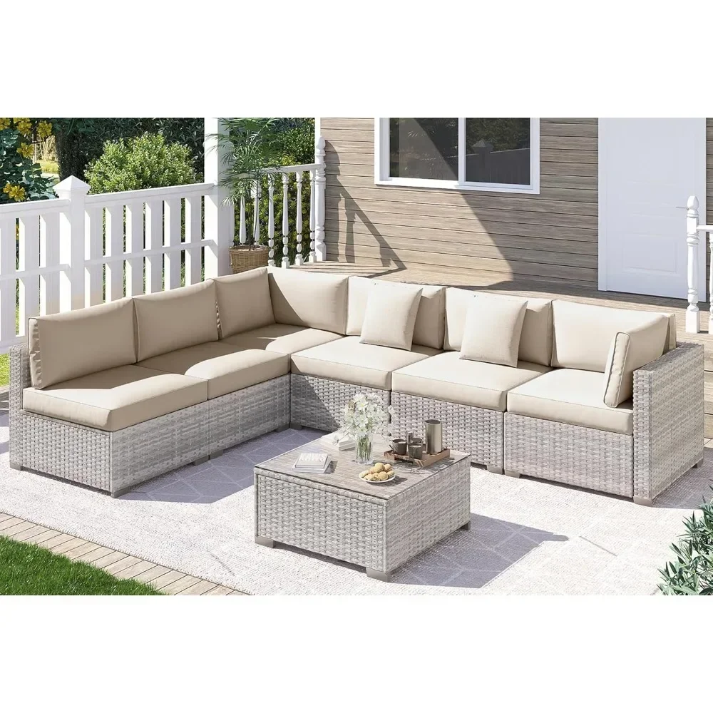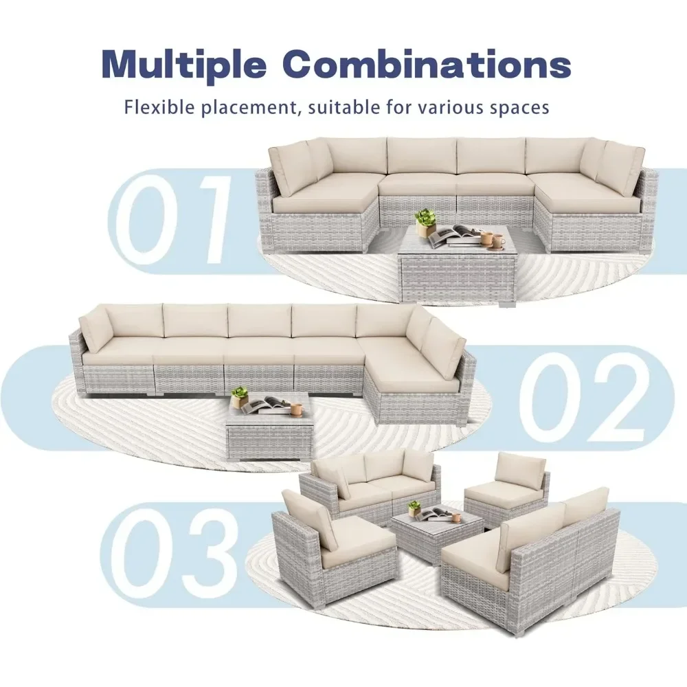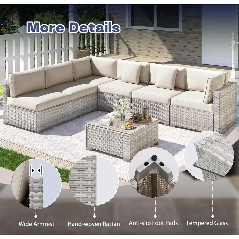 Transform your patio into a welcoming retreat with this 7-piece wicker sectional furniture set. Crafted from durable, all-weather PE rattan, it combines resilience with timeless style, ensuring beauty that lasts through every season. The set includes a spacious sectional sofa, cushioned seating, and a sleek glass-top table, creating the perfect conversation area for family gatherings, lively celebrations, or peaceful afternoons outdoors. Plush cushions provide supportive comfort, inviting you to relax and enjoy the gentle rhythm of outdoor living. The modular design allows flexible arrangement, so you can customize the layout to suit your space—whether forming a large lounge for entertaining or cozy corners for quiet reflection. The tempered glass table adds elegance and practicality, offering a sturdy surface for drinks, snacks, or decorative accents. More than furniture, this set becomes a restorative haven—an invitation to pause, breathe, and connect under the open sky. Stylish yet functional, it embodies harmony between durability and soulful design. Easy to maintain and versatile in use, this 7-piece wicker sectional is not simply décor—it is a vessel of renewal, a symbol of balance, and a daily reminder that serenity can be cultivated in the comfort of your own backyard.