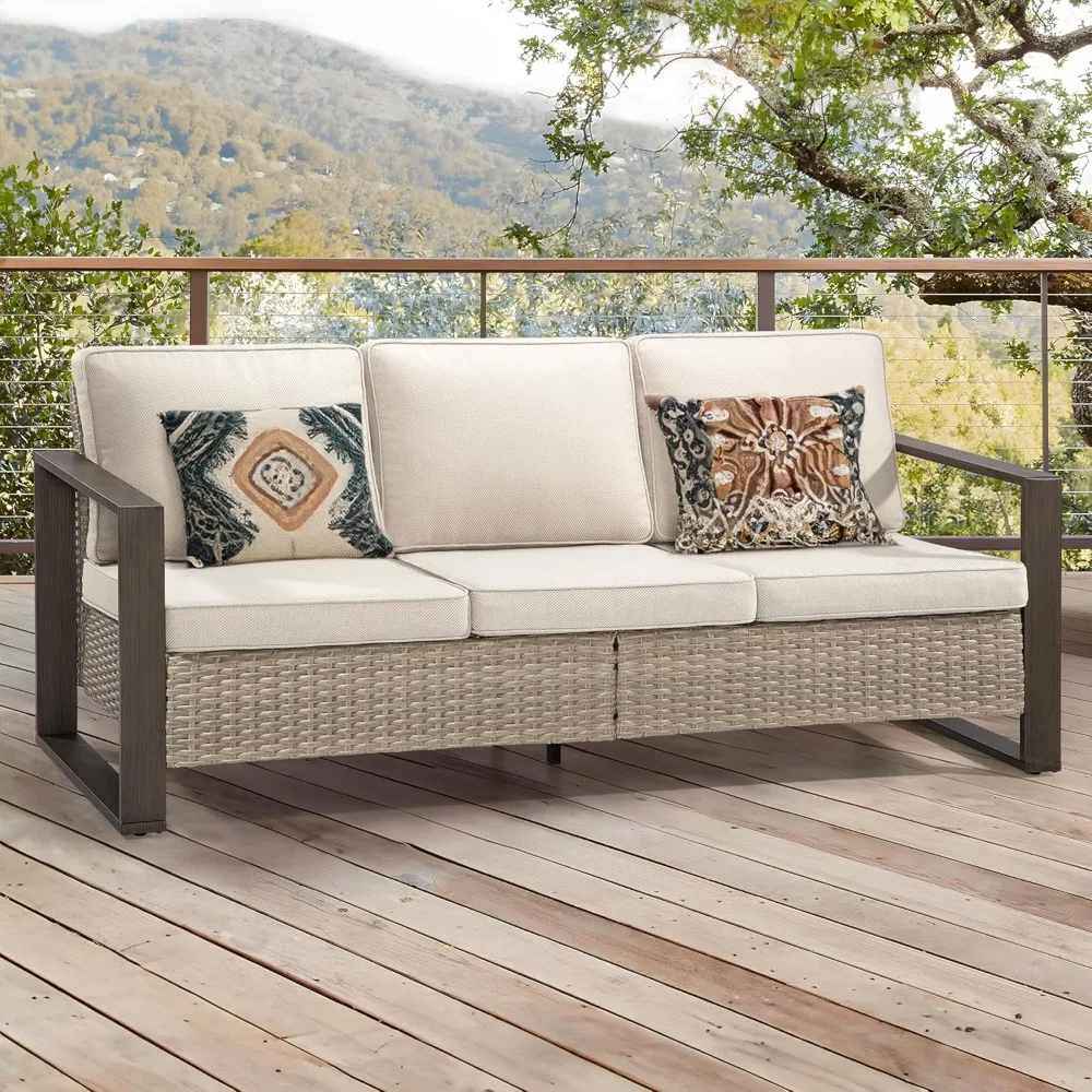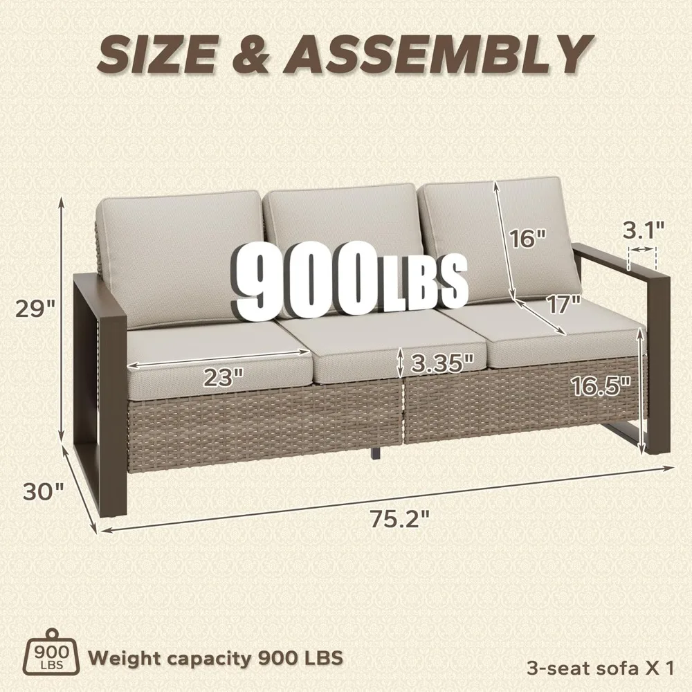 Transform your outdoor space into a serene and inviting retreat with this 75″ all-weather rattan patio sofa. Featuring a sturdy metal frame, durable wicker construction, and premium cushions, it provides comfortable seating for three while withstanding the elements. Perfect for patios, gardens, or balconies, its elegant design and durable materials create a harmonious environment for relaxation, conversation, or quiet moments in nature. This sofa blends style, comfort, and functionality, turning everyday outdoor living into a restorative and peaceful experience.