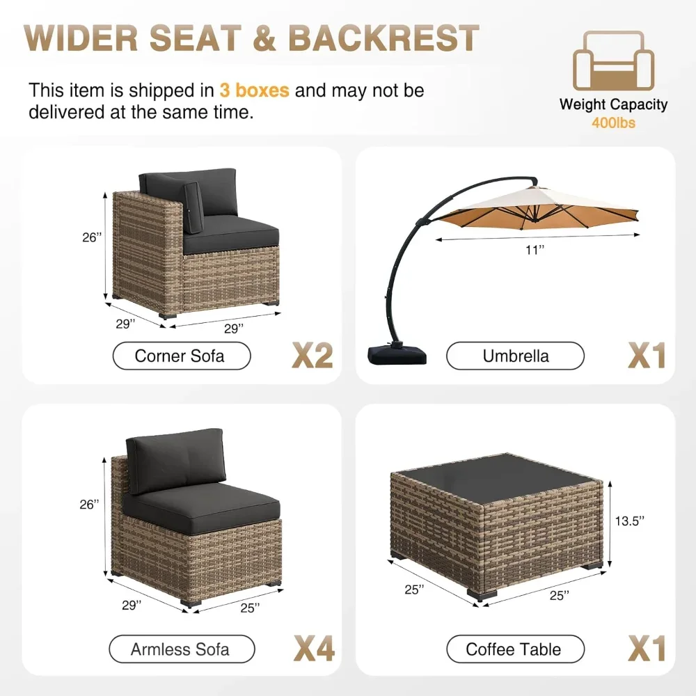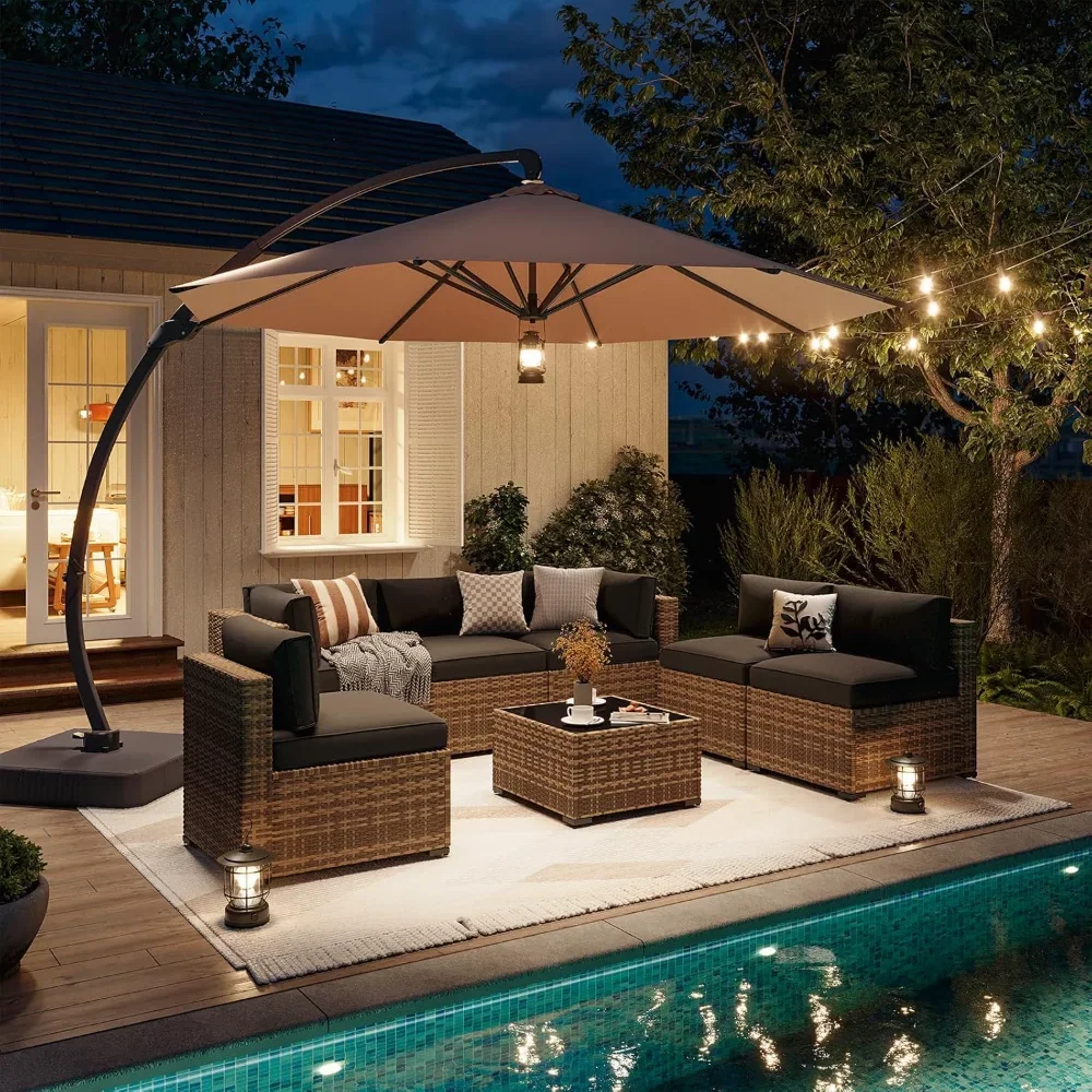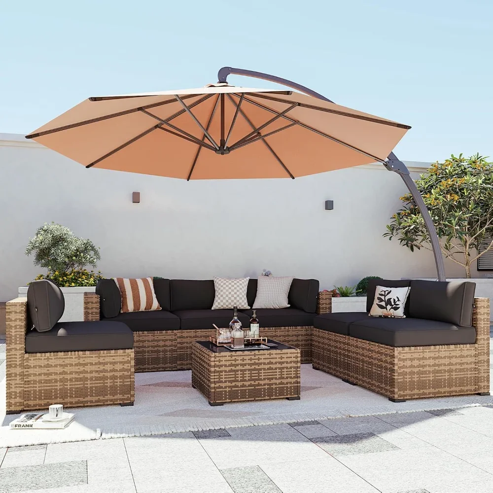 Create a sanctuary of comfort and shade with this 8-piece outdoor patio furniture set, complete with a spacious 11FT x 11FT cantilever umbrella. Crafted from durable wicker, the sectional sofa and matching pieces offer both elegance and resilience, designed to withstand the elements while maintaining timeless charm. Plush cushions invite relaxation, turning your patio, garden, or poolside into a restorative retreat. The large cantilever umbrella provides generous coverage, ensuring you and your guests can enjoy gatherings in cool comfort, shielded from the sun. Each piece is versatile and modular, allowing you to arrange the sectional to suit your space and occasion—whether for family dinners, quiet afternoons, or lively celebrations. More than furniture, this set becomes a haven of connection, a daily invitation to pause, breathe, and embrace the gentle rhythm of outdoor living. Stylish yet practical, it is not just décor—it is a vessel of renewal, a symbol of balance, and a reminder that serenity can be cultivated under the open sky.