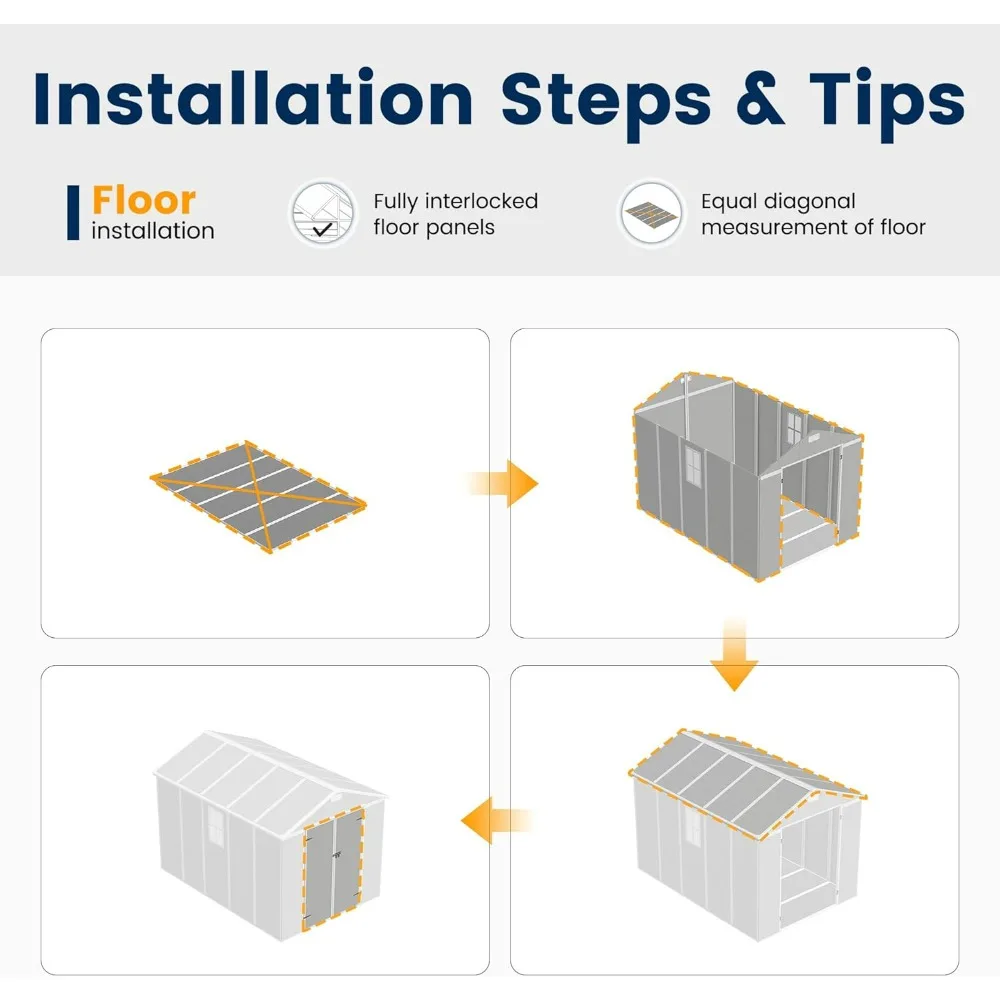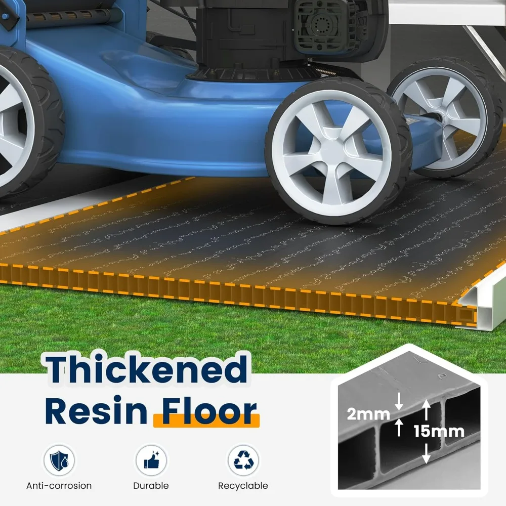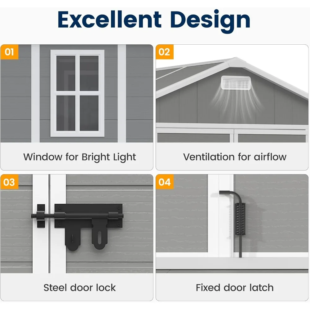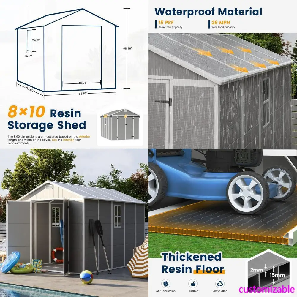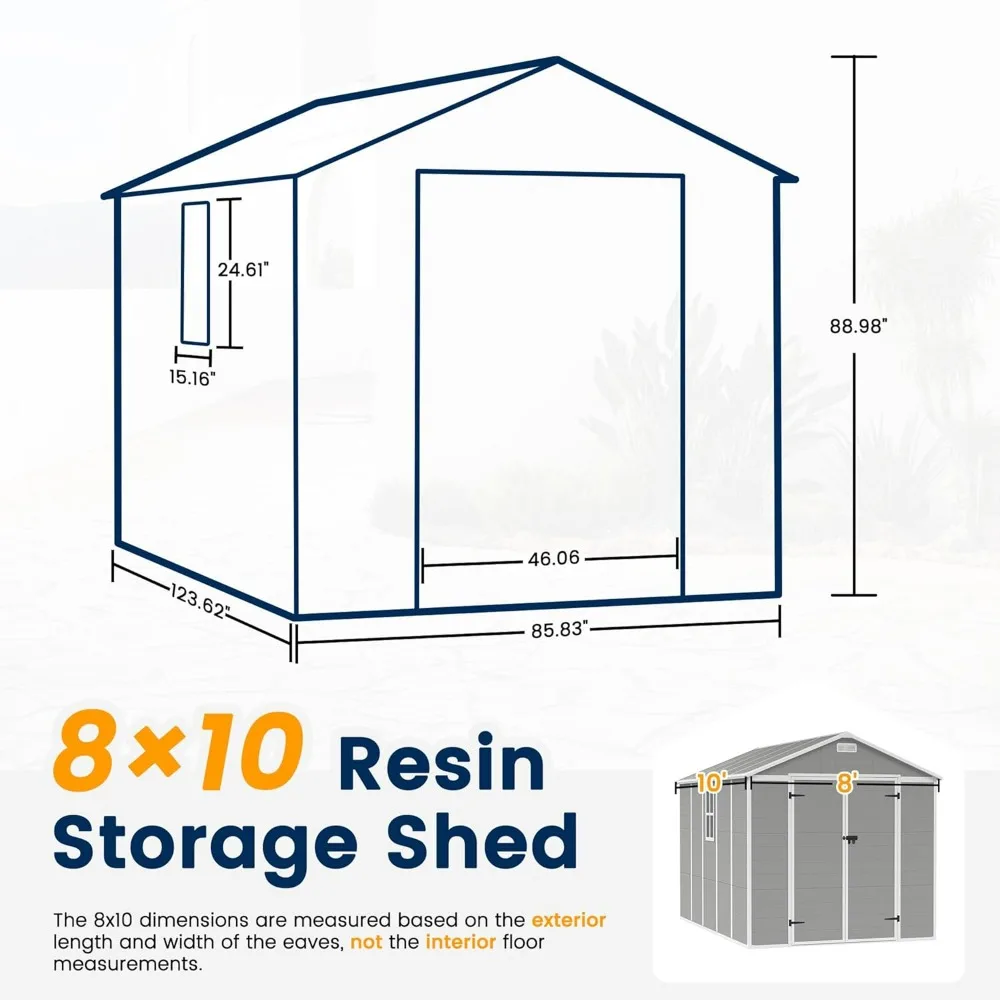 Organize your outdoor space with this spacious 8×10 resin storage shed, designed for durability and convenience. Featuring a built-in floor and lockable door, it offers secure, weather-resistant storage for garden tools, patio accessories, and seasonal equipment. The heavy-duty resin construction resists rust, rot, and fading, making it ideal for year-round use. With ample interior space and a clean, modern look, this shed is perfect for backyards, courtyards, and garden areas. Easy to assemble and built to last, it’s a smart solution for keeping your outdoor essentials protected and neatly stored.