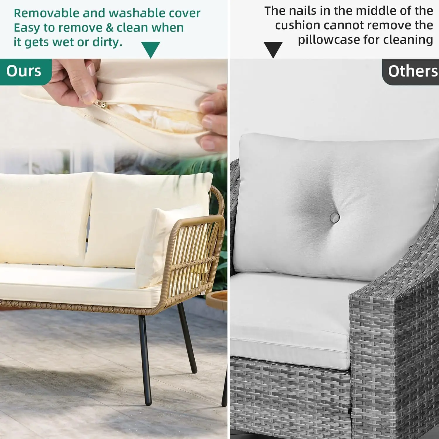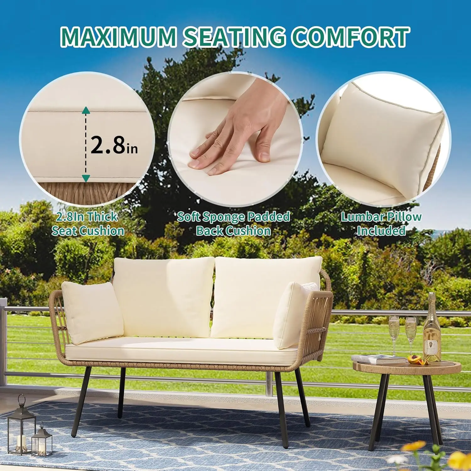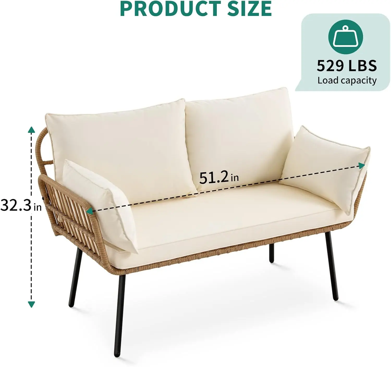 Bring comfort and charm to your outdoor living space with this all-weather wicker loveseat patio sofa. Designed with a durable wicker frame and paired with plush cushions and supportive lumbar pillows, it offers both resilience and relaxation for gardens, porches, balconies, or poolside retreats. The sectional design allows versatile placement, whether as a cozy centerpiece or part of a larger seating arrangement. Weather-resistant materials ensure lasting beauty through every season, while the soft cushions invite you to unwind in serenity. Compact yet spacious, this loveseat is perfect for quiet afternoons, family gatherings, or lively evenings under the stars. More than furniture, it becomes a restorative haven—an invitation to pause, breathe, and enjoy the gentle rhythm of outdoor living. Stylish yet practical, this wicker loveseat embodies harmony between durability and soulful design. Easy to maintain and timeless in appeal, it is not simply décor—it is a vessel of renewal, a symbol of balance, and a daily reminder that serenity can be cultivated in the comfort of your own backyard.