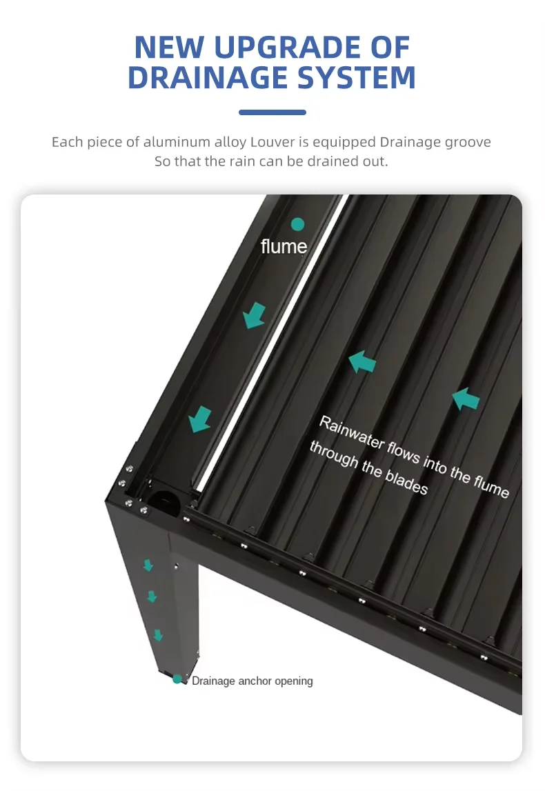 Perfect for luxury homes, hotels, restaurants, or outdoor lounges, this high-end pergola turns any exterior area into an all-season living space—combining shade, shelter, and style in one sleek, automated system.