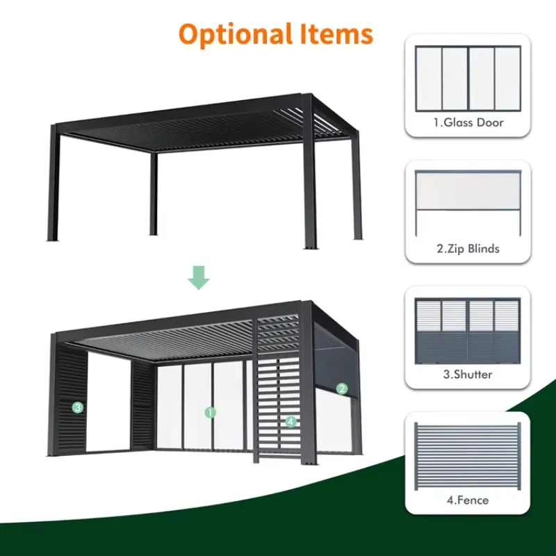 Upgrade your outdoor space with this modern Electric Aluminum Bioclimatic Pergola, engineered with a fully adjustable louvered roof for year-round comfort and weather control. The motorized louvers rotate at the touch of a button, allowing you to switch between full sun, filtered shade, or complete waterproof coverage during rain.