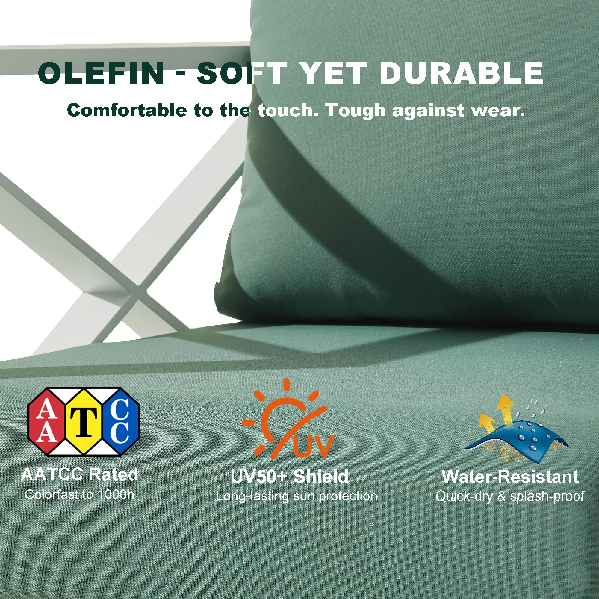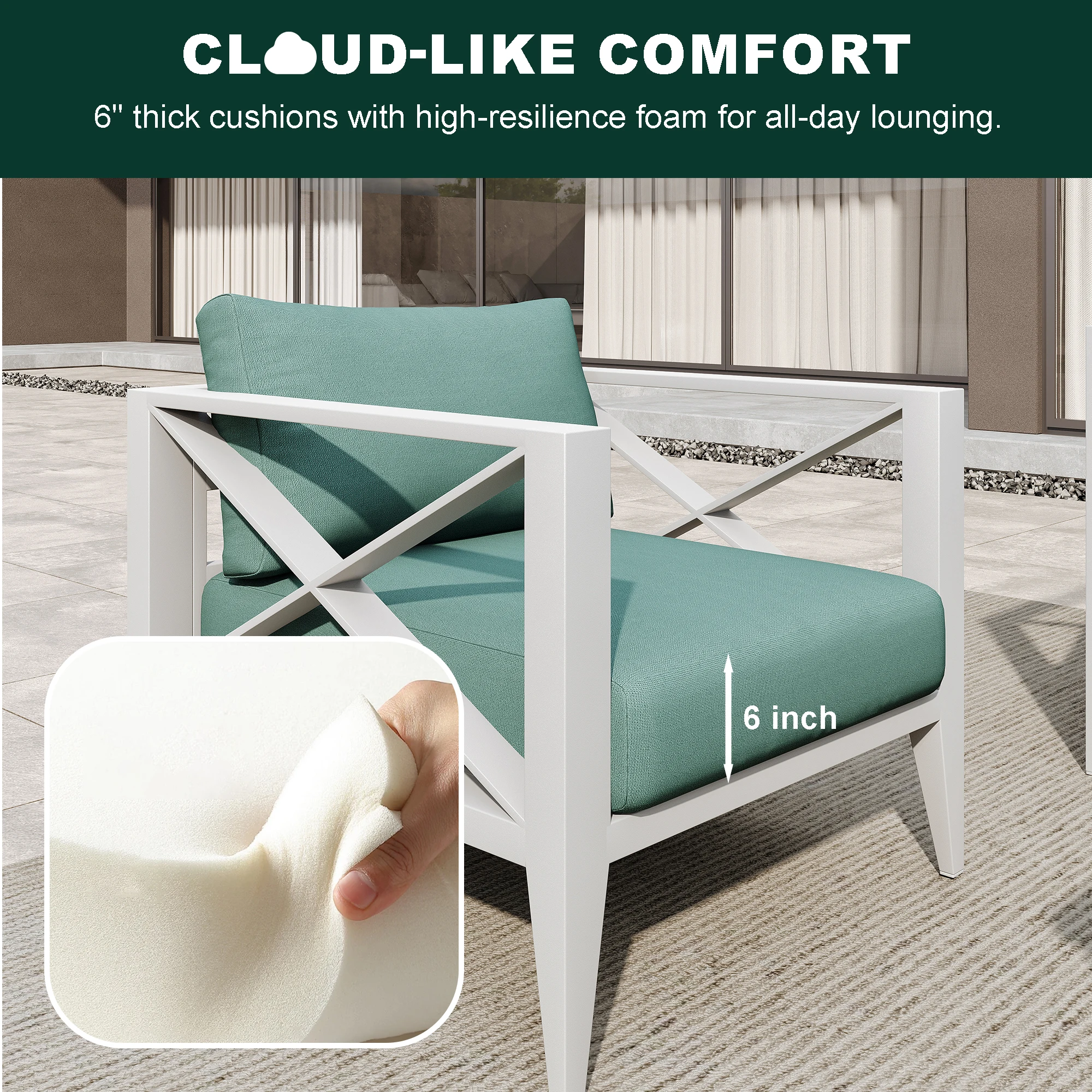 Elevate your outdoor living with this aluminum patio furniture set, a modern sectional designed for both style and durability. Crafted with a sleek aluminum frame, it offers weather-resistant strength while maintaining a lightweight design that’s easy to arrange in gardens, porches, balconies, or yards. The sectional seating provides ample space for family gatherings or quiet evenings, while the matching coffee table adds convenience and elegance—perfect for drinks, snacks, or decorative accents. Soft cushions invite relaxation, turning every moment outdoors into a restorative experience. More than furniture, this set becomes a sanctuary of connection, a daily invitation to pause, breathe, and enjoy the gentle rhythm of outdoor living. Its contemporary design blends seamlessly with any décor, embodying harmony between practicality and soulful elegance. Durable, stylish, and easy to maintain, this aluminum conversation set is not simply décor—it is a vessel of renewal, a symbol of balance, and a reminder that serenity can be cultivated under the open sky.