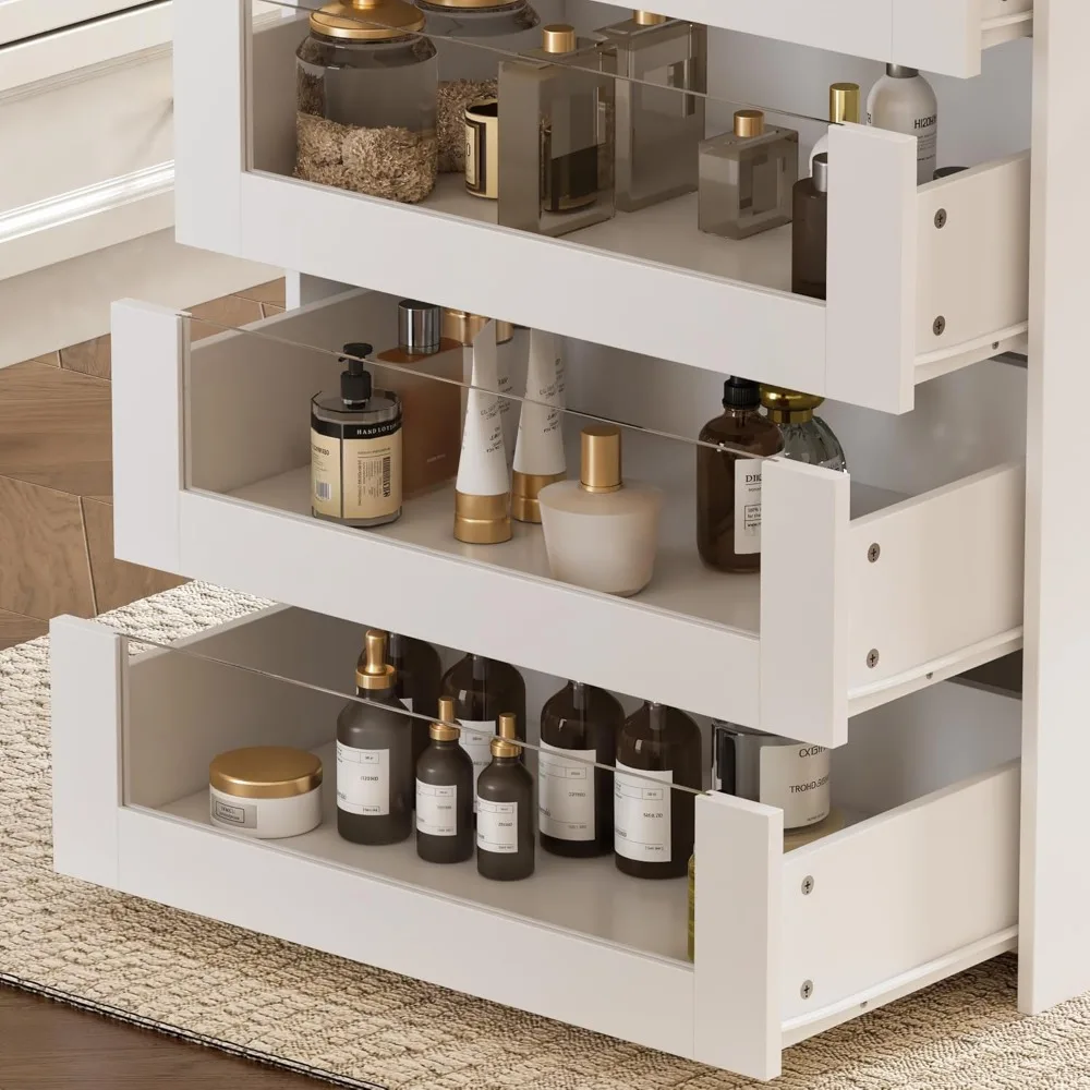 Elevate your walk-in closet with this stylish Closet Island, featuring a glass top, glass shelf, and eight spacious drawers for jewelry, accessories, and essentials. Designed to combine function with elegance, it keeps your items beautifully displayed yet neatly organized, creating a visually calm and luxurious environment. The glass top allows you to showcase favorite pieces while maintaining a clutter-free space, making daily dressing routines effortless and enjoyable. Perfect for adding a touch of sophistication and serenity, this island transforms your closet into a harmonious retreat where style, organization, and relaxation meet.