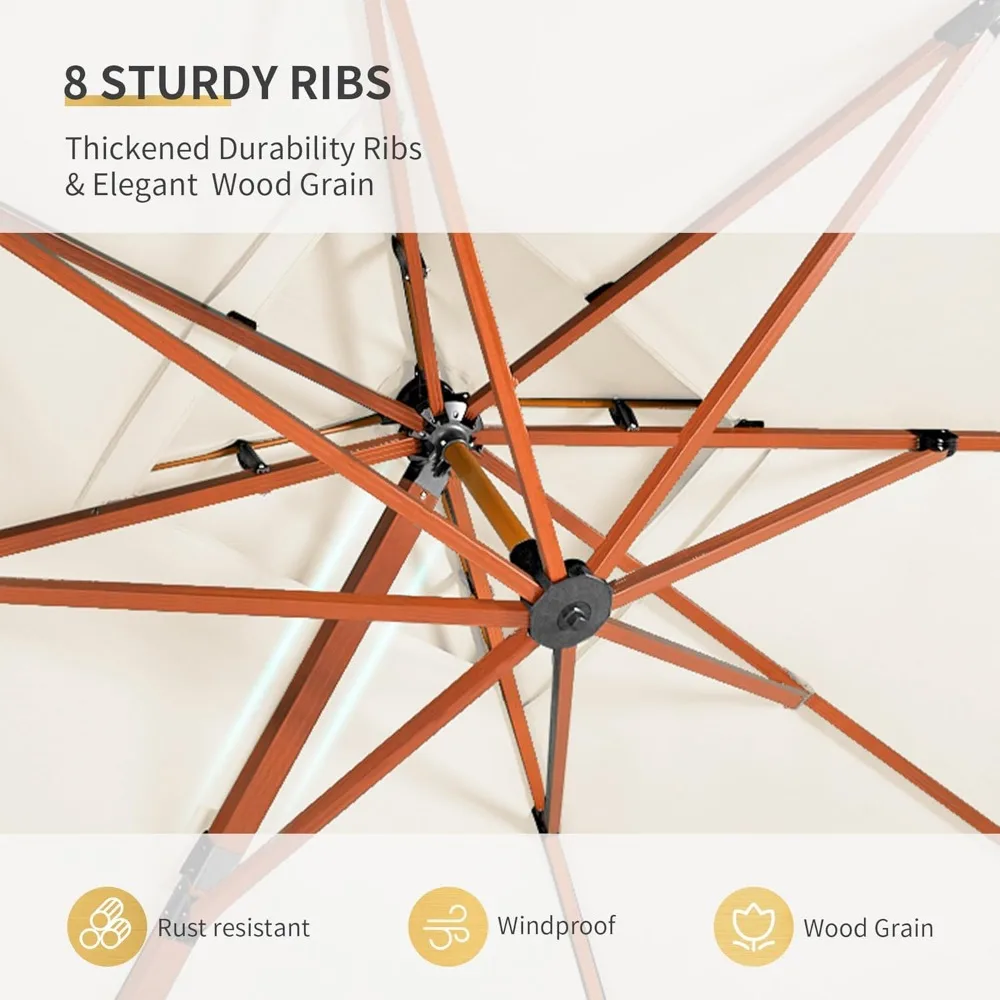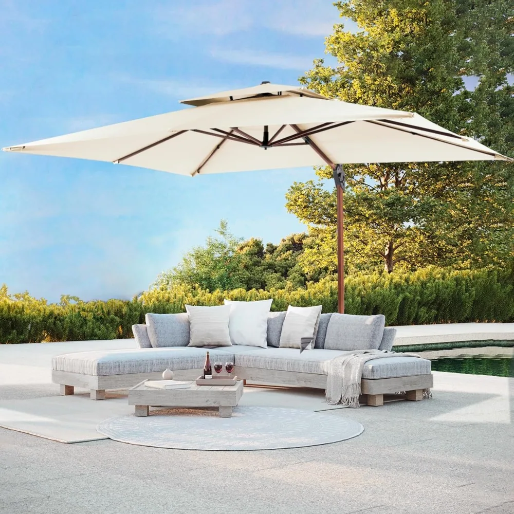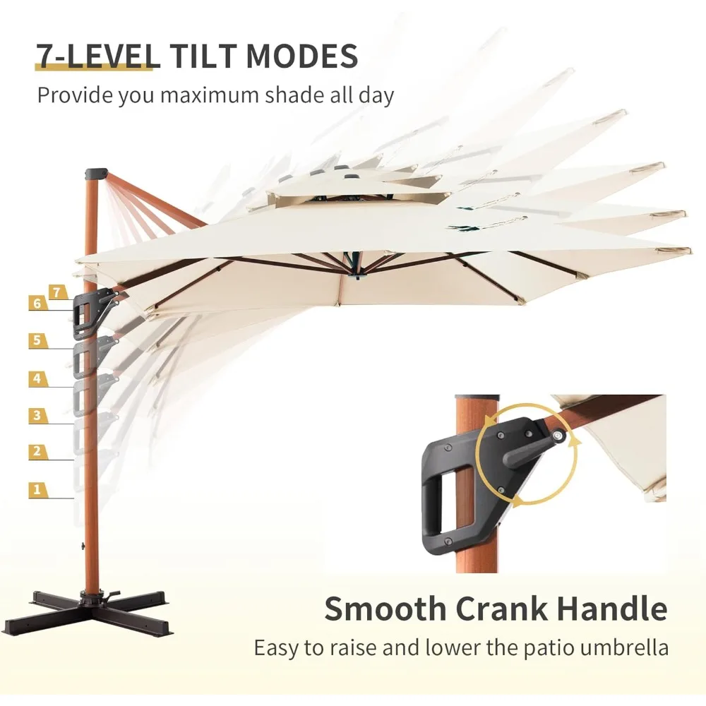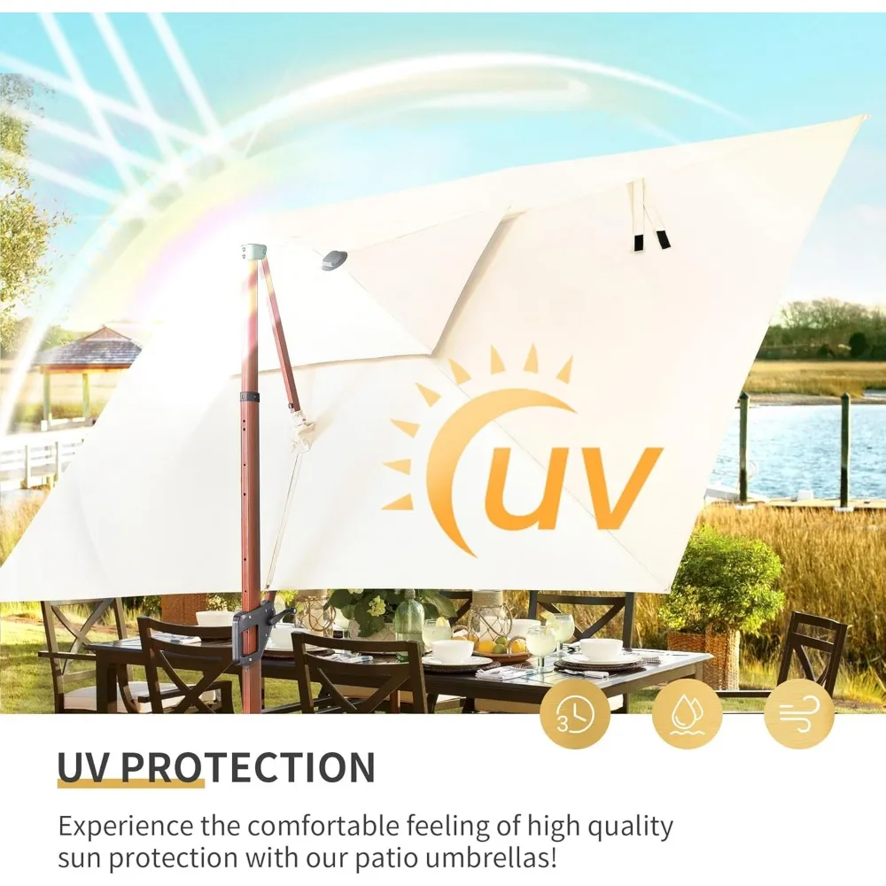 Create generous shade and modern style in your outdoor space with this 10 x 13 ft Rectangle Cantilever Patio Umbrella. Featuring a heavy-duty offset design, it provides wide coverage without a center pole, making it perfect for shading dining tables, lounge areas, poolside seating, or commercial patios. The double-top canopy enhances airflow and heat ventilation, while the wood-grain finish adds a sophisticated, natural look with durable, weather-resistant construction.
