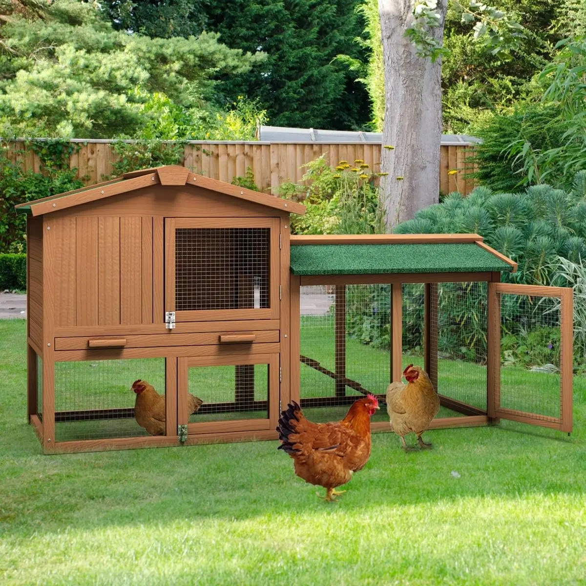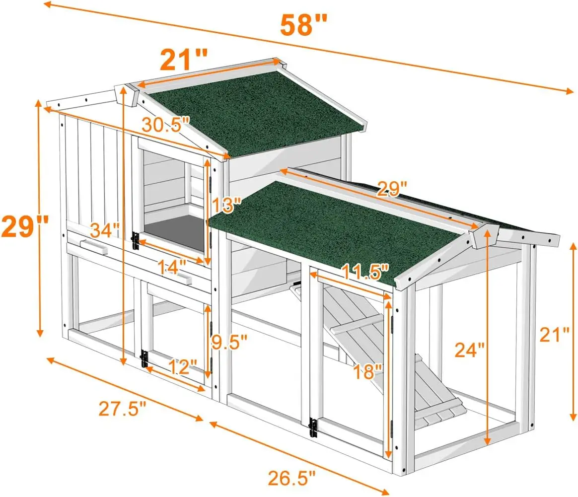 This 58-inch large wooden chicken coop provides a secure and comfortable outdoor home for chickens, rabbits, or other small animals. Built with a sturdy wood frame and weather-resistant finish, it features a raised nesting area, an enclosed run, and an easy-access ramp for safe movement between levels. The coop includes lockable doors and ventilation windows to keep pets protected while allowing fresh airflow. Its compact yet spacious design makes it ideal for backyards, gardens, or hobby farms, offering enough room for multiple hens or small pets to roam, rest, and nest. Easy to clean and maintain, this coop is a practical solution for anyone looking to raise poultry or house small animals with confidence and convenience.