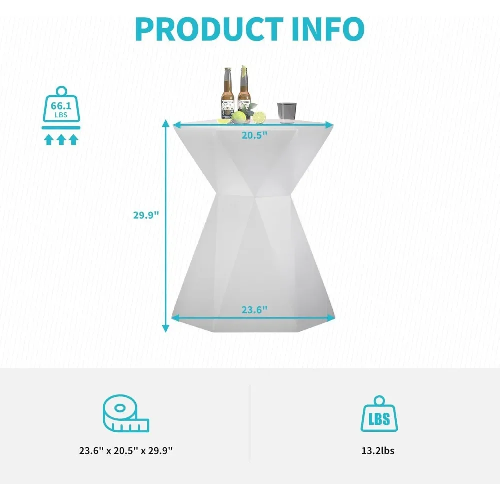 Illuminate your home or entertaining space with this 30-inch LED bar table, thoughtfully designed to combine vibrant style, functionality, and immersive ambiance. Featuring 16 RGB color-changing lights and a convenient remote control, it allows you to create dynamic moods for gatherings, parties, or quiet evenings. Waterproof and rechargeable, this luminous furniture piece offers versatile placement indoors or outdoors, adding a contemporary and captivating focal point to any bar area, patio, or lounge. Durable and visually striking, it transforms ordinary spaces into serene, vibrant hubs where entertainment, relaxation, and restorative enjoyment naturally coexist.