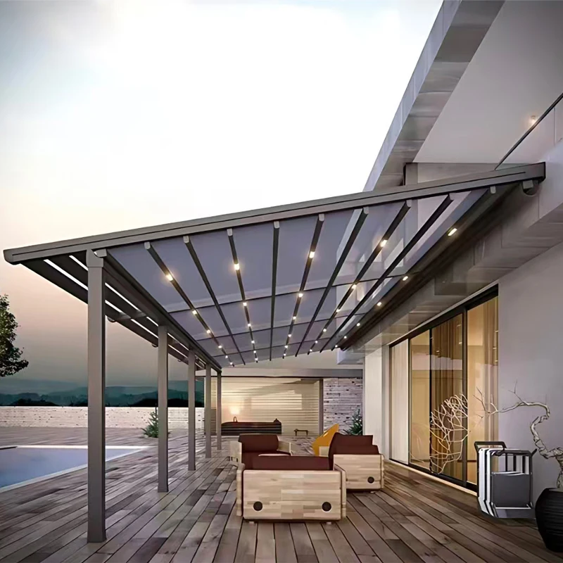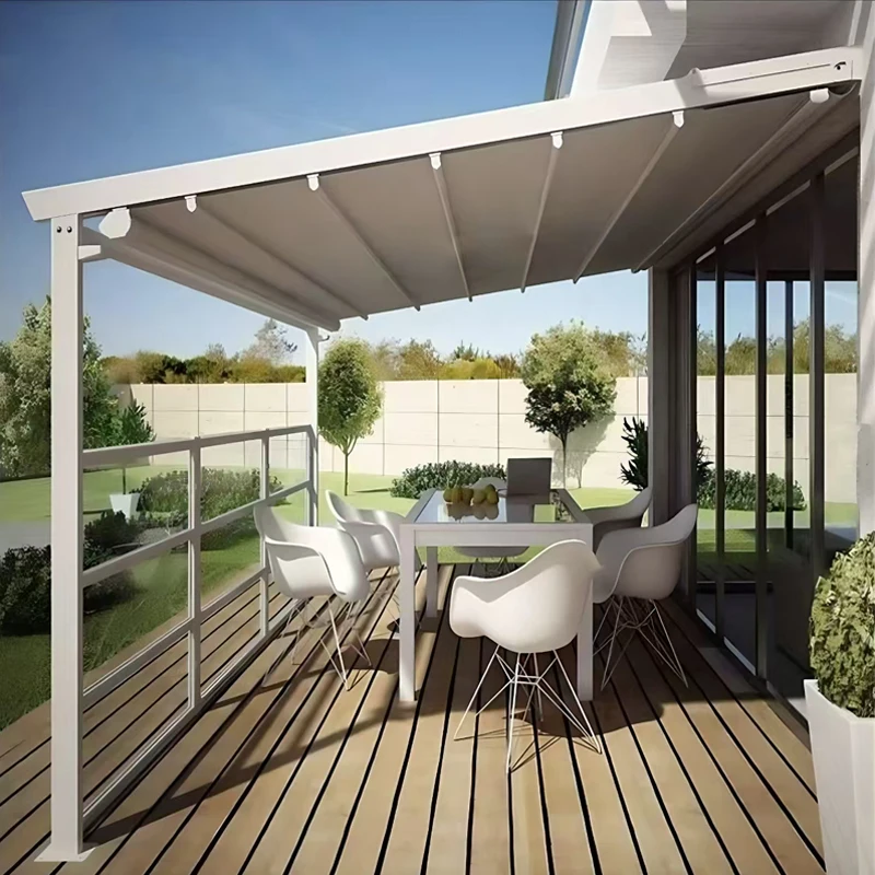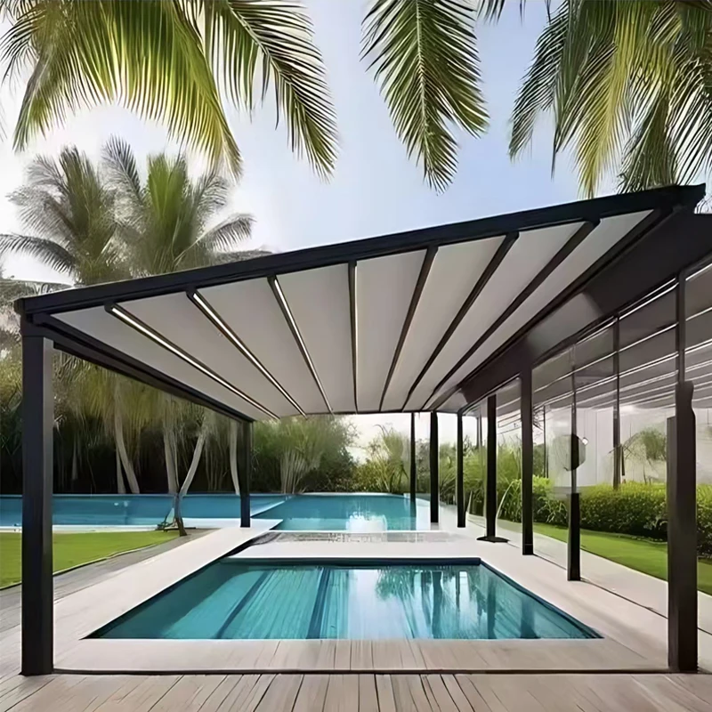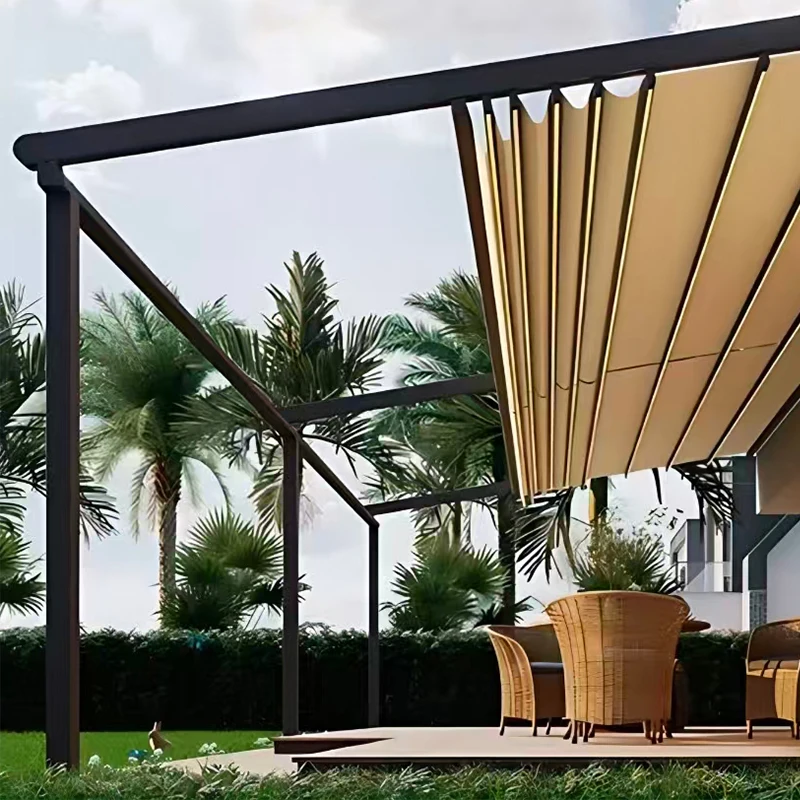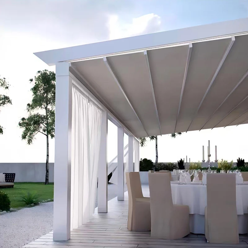 This motorized retractable aluminum pergola provides a modern, stylish, and weather-resistant shade solution for patios, terraces, and garden spaces. Built with a durable aluminum frame and retractable roof system, it offers instant sun and rain protection at the touch of a button. The smart design is wind and rain sensor–ready, allowing automatic adjustment based on weather conditions for added convenience and safety. Perfect for outdoor dining, lounging, or entertaining, the pergola creates a comfortable, customizable space that enhances any backyard or commercial setting. Its sleek structure is low-maintenance, rust-resistant, and engineered for long-term outdoor use. Whether used for a home patio, café seating area, or poolside retreat, this motorized pergola delivers shade, shelter, and modern functionality in one elegant solution.