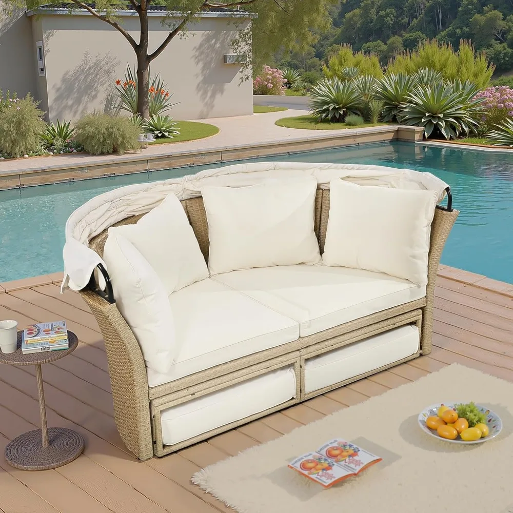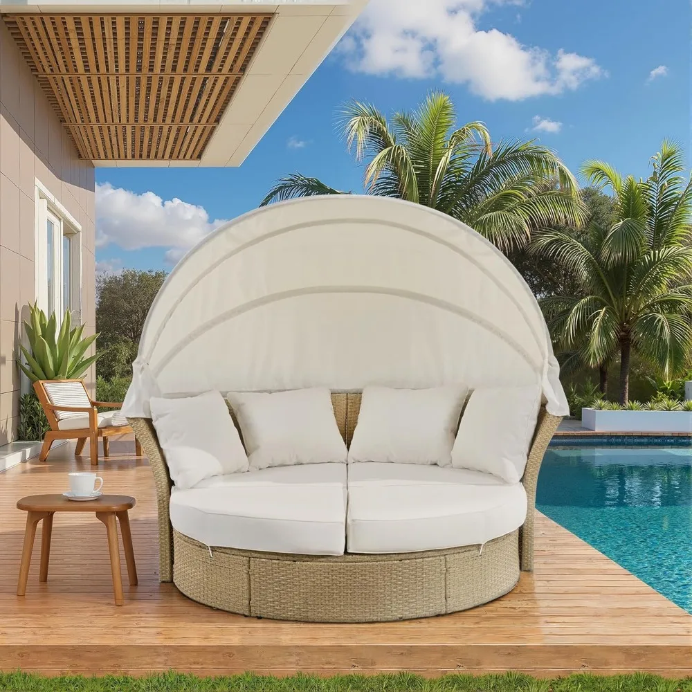Create a relaxing outdoor retreat with this stylish rattan patio daybed, featuring a spacious round design and a retractable canopy for adjustable shade. Crafted from weather-resistant wicker, it includes plush cushions and four matching pillows for maximum comfort, making it perfect for lounging, reading, sunbathing, or hosting guests. The modular seating design allows it to be used as a full daybed or separated into individual pieces for flexible outdoor arrangements. Ideal for patios, poolside areas, gardens, or terraces, this double daybed brings resort-style comfort to your home. Durable, elegant, and easy to maintain, it’s the perfect blend of luxury and functionality for any outdoor space.