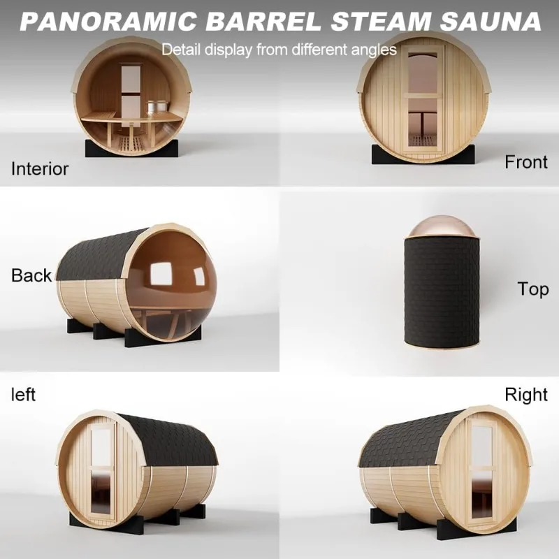 This outdoor panoramic wooden sauna offers a luxurious at-home spa experience with its spacious 70.86 x 74.86 inch design and premium 220V electric heater. Crafted from high-quality wood, it combines natural insulation with a modern curved viewing window, creating an immersive and relaxing atmosphere. The wide transparent panel allows you to enjoy scenic outdoor views while benefiting from soothing heat therapy that promotes muscle recovery, stress relief, and improved circulation. Perfect for gardens, patios, lakeside cabins, or wellness spaces, this sauna is built for durability, weather resistance, and year-round enjoyment. A stylish upgrade to any outdoor living area, it provides the comfort of a professional spa in the privacy of your own home.