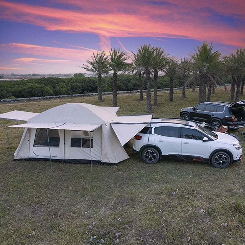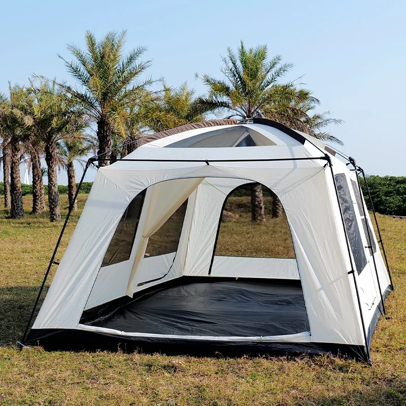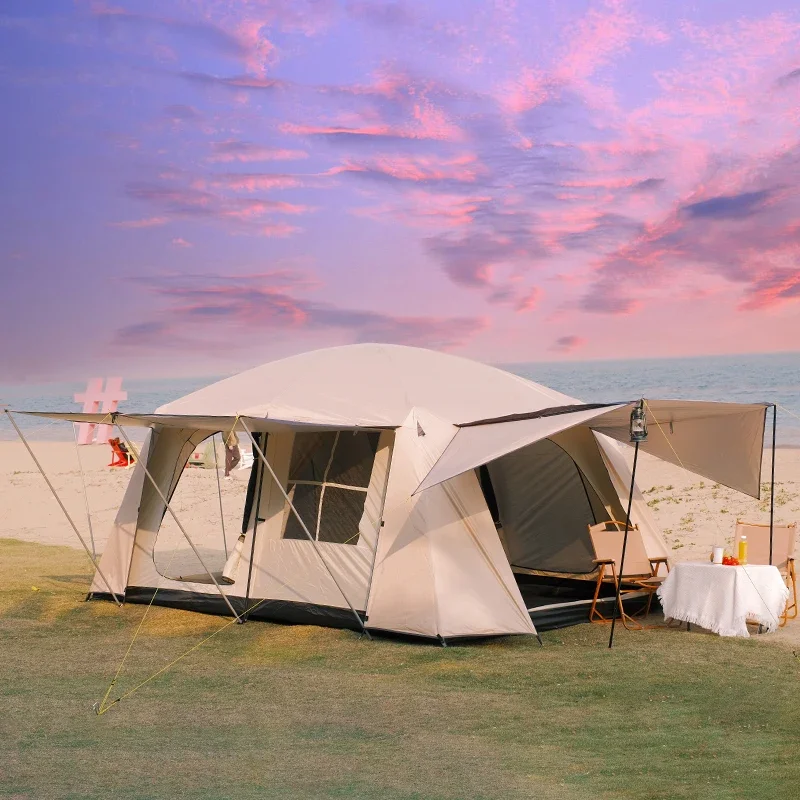 Experience spacious outdoor comfort with this Oversized 13㎡ Double-Layer Camping Tent, designed for families or group adventures. Featuring two private bedrooms and four multifunctional halls, this tent offers ample room for sleeping, lounging, and gear storage. The thickened double-layer construction provides excellent insulation and durability, while its rainproof and sunproof materials ensure all-weather protection. Easy to fold and transport, this portable tent is ideal for camping, festivals, or backyard retreats—bringing home-like comfort to the great outdoors.