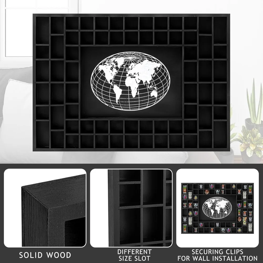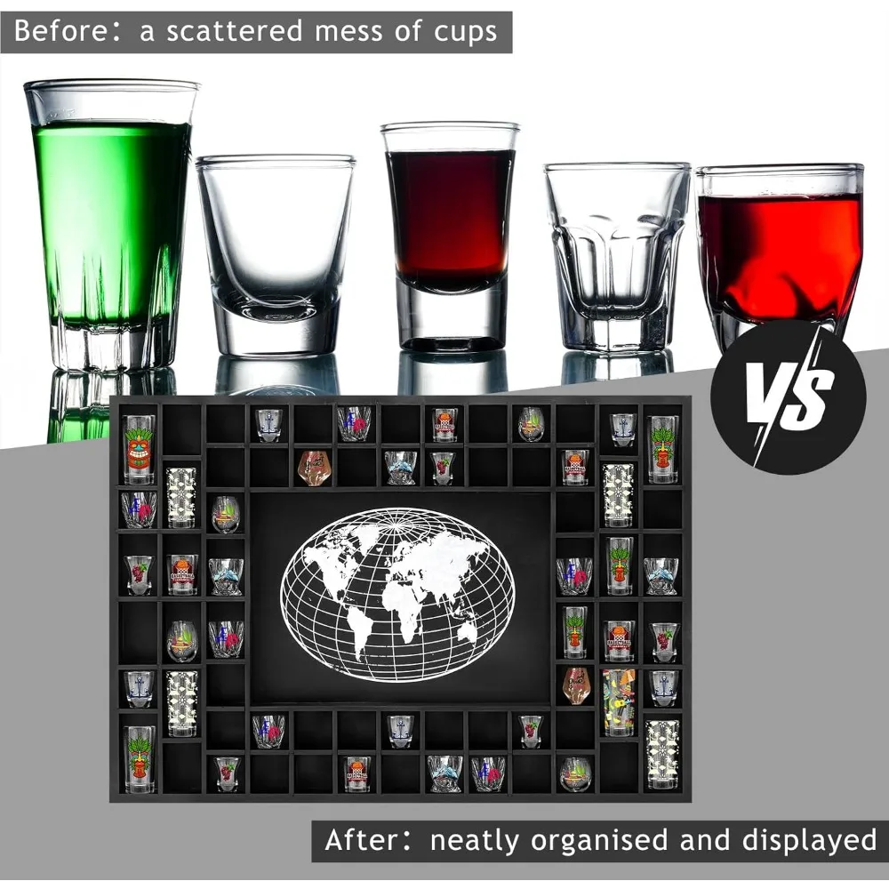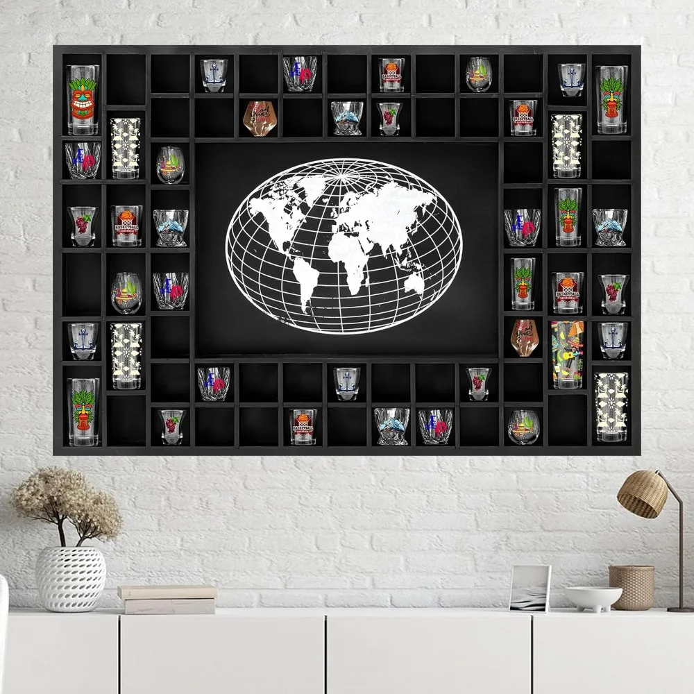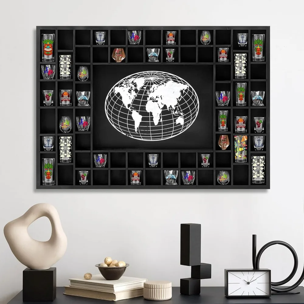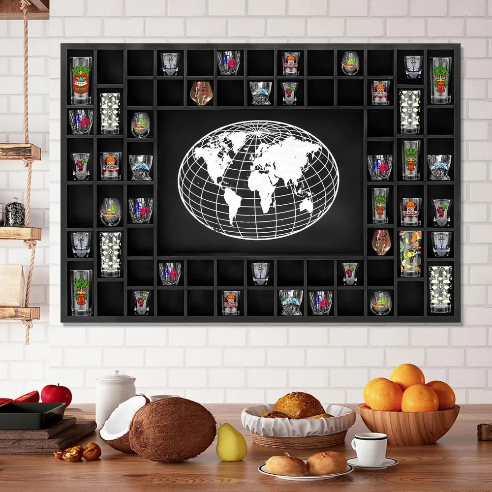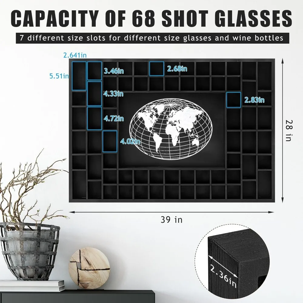 Showcase your collection in style with this large rustic wood shot glass display case, thoughtfully designed to blend functionality, charm, and a touch of wanderlust. Featuring 68 slots and a world map design, it accommodates multiple sizes of shot glasses and wine glasses while keeping your collection organized and beautifully displayed. Perfect for home bars, kitchens, or entertainment areas, this display case transforms ordinary storage into a visually striking centerpiece. Its rustic wood finish adds warmth and character, creating a serene and inviting atmosphere where your barware and collectibles are both admired and easily accessible.