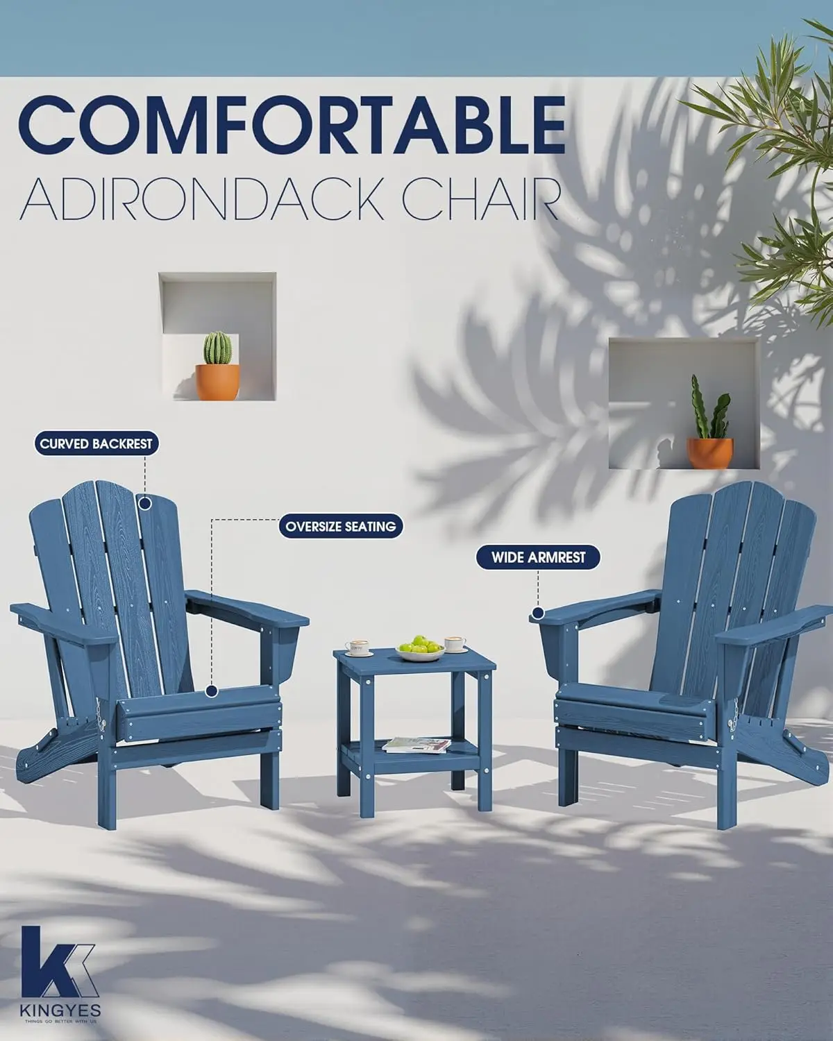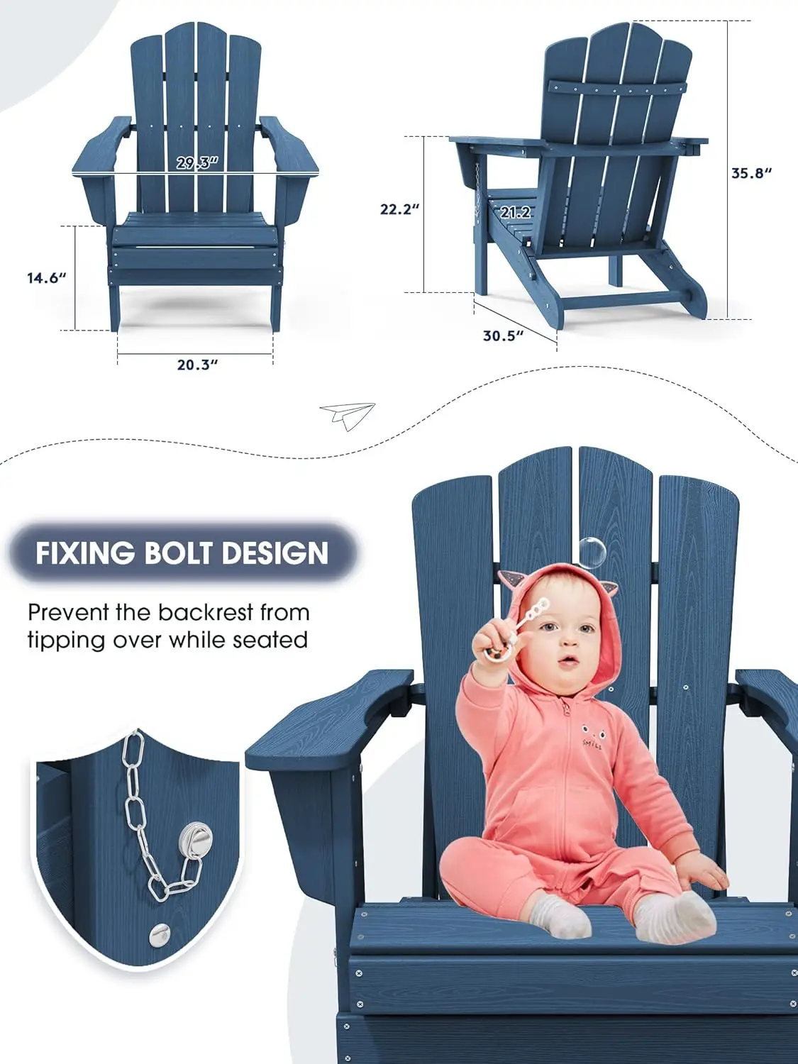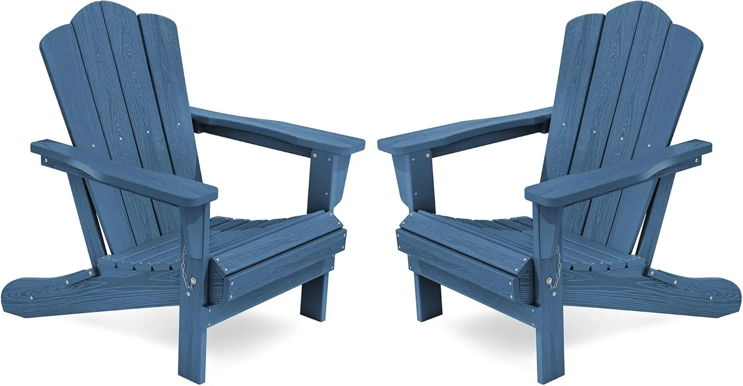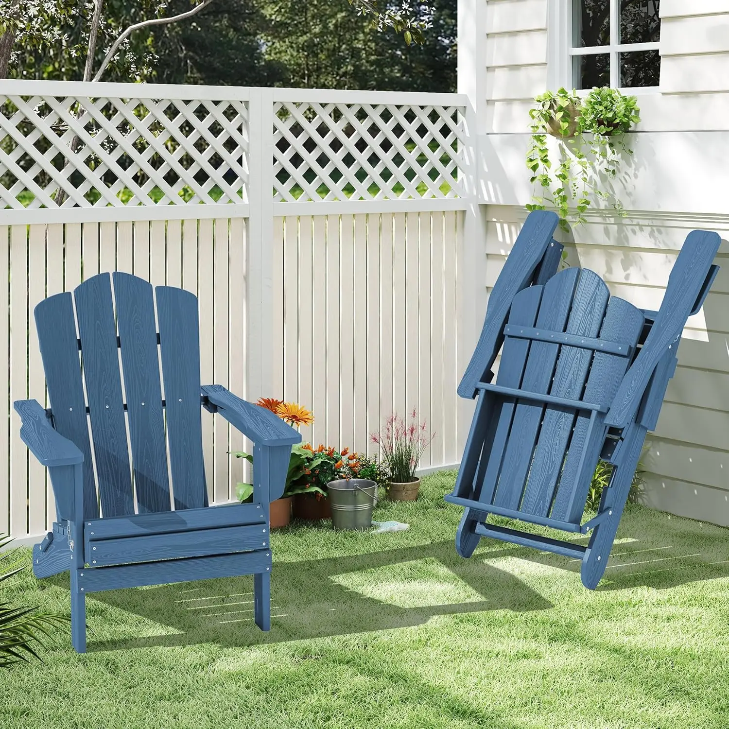 Enjoy timeless outdoor comfort with this set of two folding Adirondack chairs, crafted from durable HDPE material designed to withstand sun, rain, snow, and everyday use. Unlike wood, HDPE won’t crack, splinter, or fade, making these chairs a long-lasting choice for patios, decks, pool areas, and fire pit seating. The foldable design allows for easy storage and transport, while the classic wide backrest, deep seat, and contoured armrests deliver the relaxed feel Adirondack chairs are known for. Finished in a rich navy color, they add a stylish coastal touch to any outdoor space. Low maintenance and easy to clean, these all-weather chairs offer both convenience and comfort, perfect for year-round lounging, entertaining, or quiet moments outdoors.