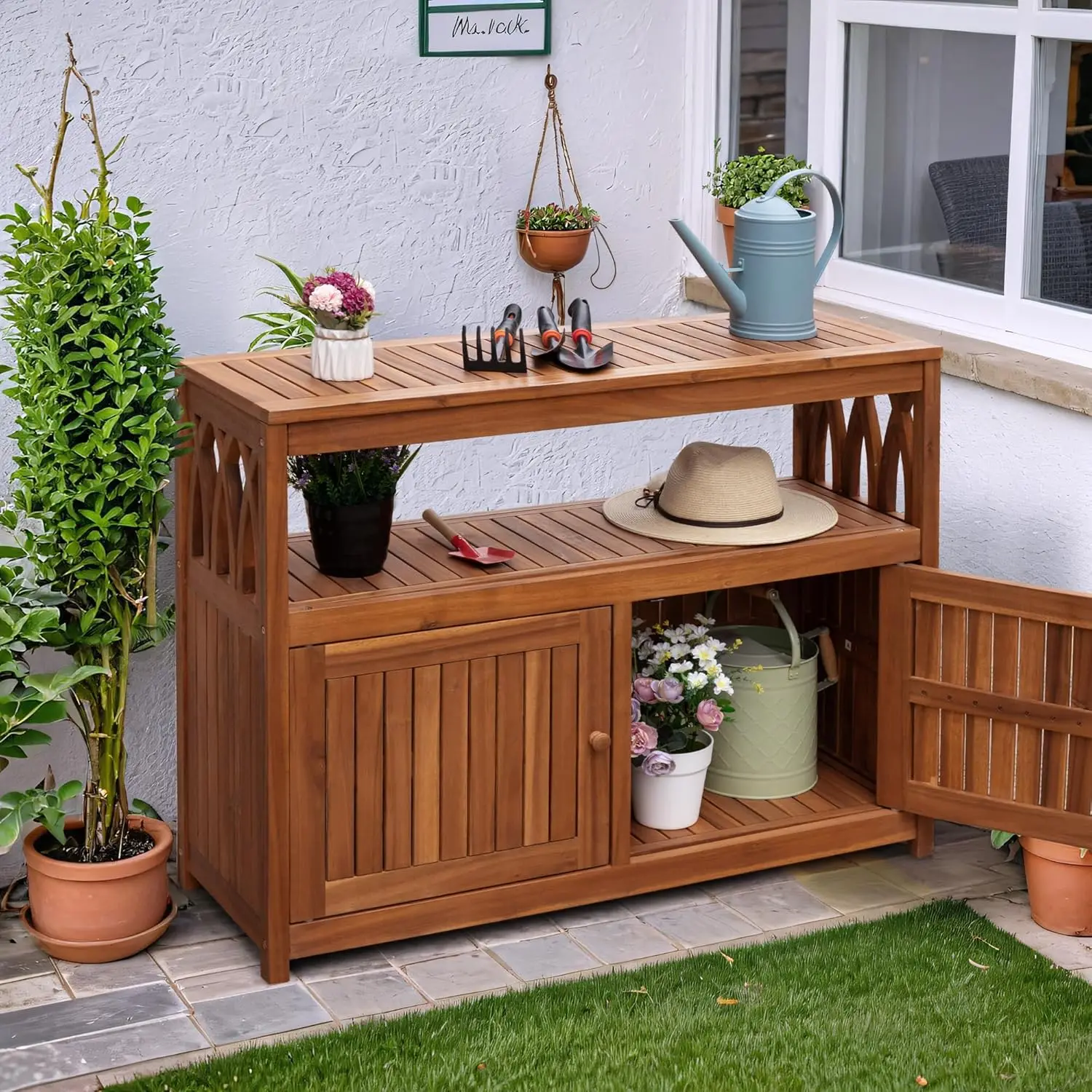 Enhance your outdoor gatherings with this weatherproof acacia wood bar table, thoughtfully designed to combine style, durability, and restorative elegance. Its spacious tabletop and two magnetic-door cabinets provide convenient storage for drinks, barware, or entertaining essentials, keeping your space organized and inviting. Crafted from durable, weather-resistant acacia wood, it withstands outdoor elements while offering a warm, natural aesthetic that complements patios, gardens, or backyard spaces. Perfect for casual lounging, intimate gatherings, or peaceful afternoons outdoors, this bar table transforms any area into a serene retreat where relaxation, connection, and tasteful entertaining naturally coexist.