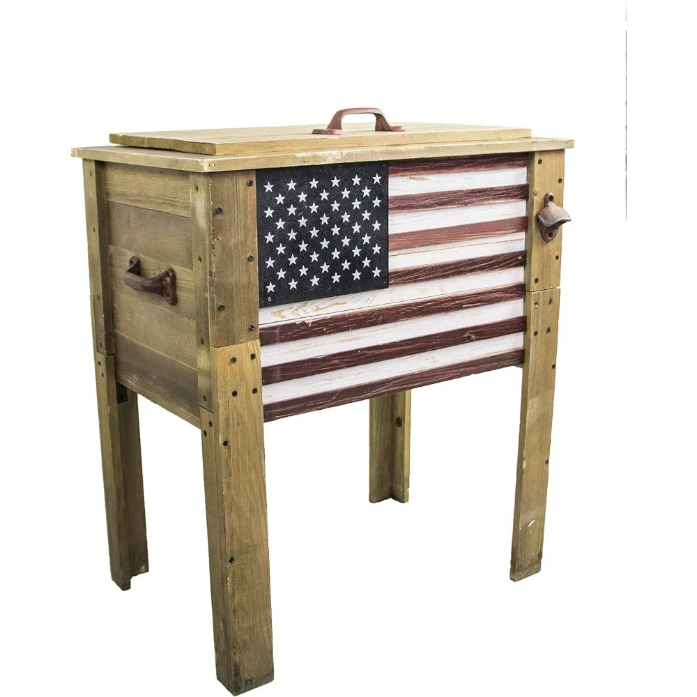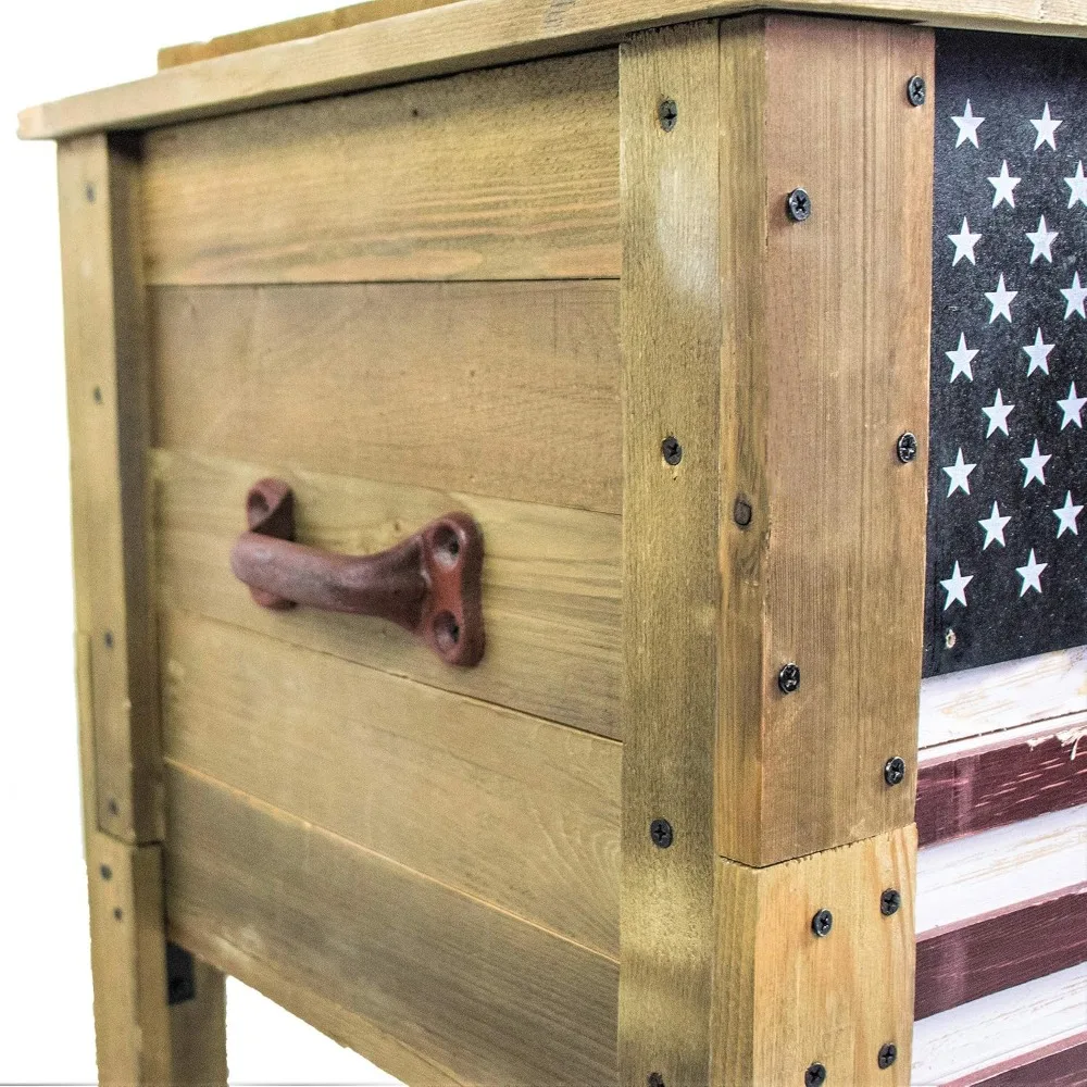This wooden patio beverage cooler brings rustic charm and convenient drink storage to any porch, deck, or backyard gathering. Featuring a 57-quart insulated interior, it can hold plenty of ice and beverages, keeping drinks cold for hours during barbecues, pool parties, tailgates, or family events. The American flag design adds a patriotic touch, making it both a functional cooler and a decorative outdoor accent. Built with sturdy wood construction and a hinged, easy-lift lid, it includes a built-in bottle opener, side handle, and bottom shelf for extra storage or display. Perfect for entertaining or everyday outdoor use, this cooler combines style, durability, and practicality in one eye-catching piece.